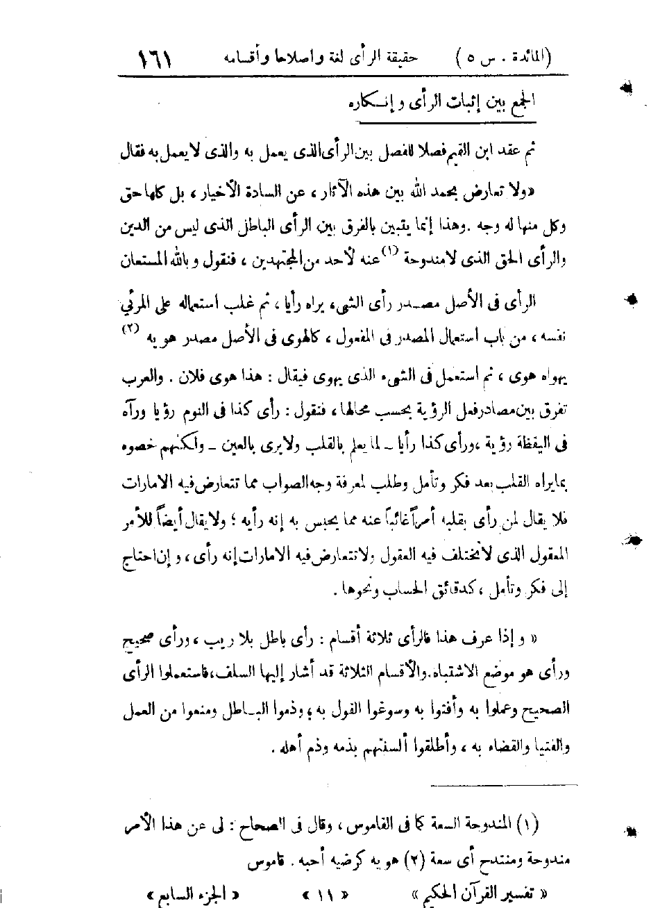 (أَقُولُ) : إِنَّ الْعَلَّامَةَ الشَّاطِبِيَّ قَدْ حَرَّرَ بَحْثَ الْبِدَعِ وَأَطَالَ فِي التَّنْفِيرِ عَنْهَا وَالْحَثِّ عَلَى الْتِزَامِ السُّنَّةِ فِي كِتَابِهِ (الِاعْتِصَامِ) بِمَا لَمْ يَسْبِقْ إِلَى مِثْلِهِ - بِحَسَبِ عِلْمِهِ وَعِلْمِنَا - سَابِقٌ، وَلَمْ يَلْحَقْهُ فِيهِ عَلَى مَا وَصَلَ إِلَيْهِ عِلْمُنَا لَاحِقٌ، وَمِنْ ذَلِكَ أَنَّهُ فَرَّقَ بَيْنَ الْبِدَعِ وَبَيْنَ الْمَصَالِحِ الْمُرْسَلَةِ تَفْرِقَةً وَاضِحَةً بَيِّنَةً، وَأَثْبَتَ أَنَّ مَالِكًا كَانَ يَقُولُ بِهَا عَلَى تَشَدُّدِهِ فِي نَصْرِ السُّنَّةِ، وَمُبَالَغَتِهِ فِي مُقَاوَمَةِ الْبِدَعِ، حَتَّى قَالَ أَحْمَدُ بْنُ حَنْبَلٍ فِيهِ: إِذَا رَأَيْتَ الرَّجُلَ يُبْغِضُ مَالِكًا فَاعْلَمْ أَنَّهُ مُبْتَدِعٌ، وَقَالَ عَبْدُ الرَّحْمَنِ بْنُ مَهْدِيٍّ: إِذَا رَأَيْتَ الْحِجَازِيَّ يُحِبُّ مَالِكَ بْنَ أَنَسٍ فَاعْلَمْ أَنَّهُ صَاحِبُ سُنَّةٍ.