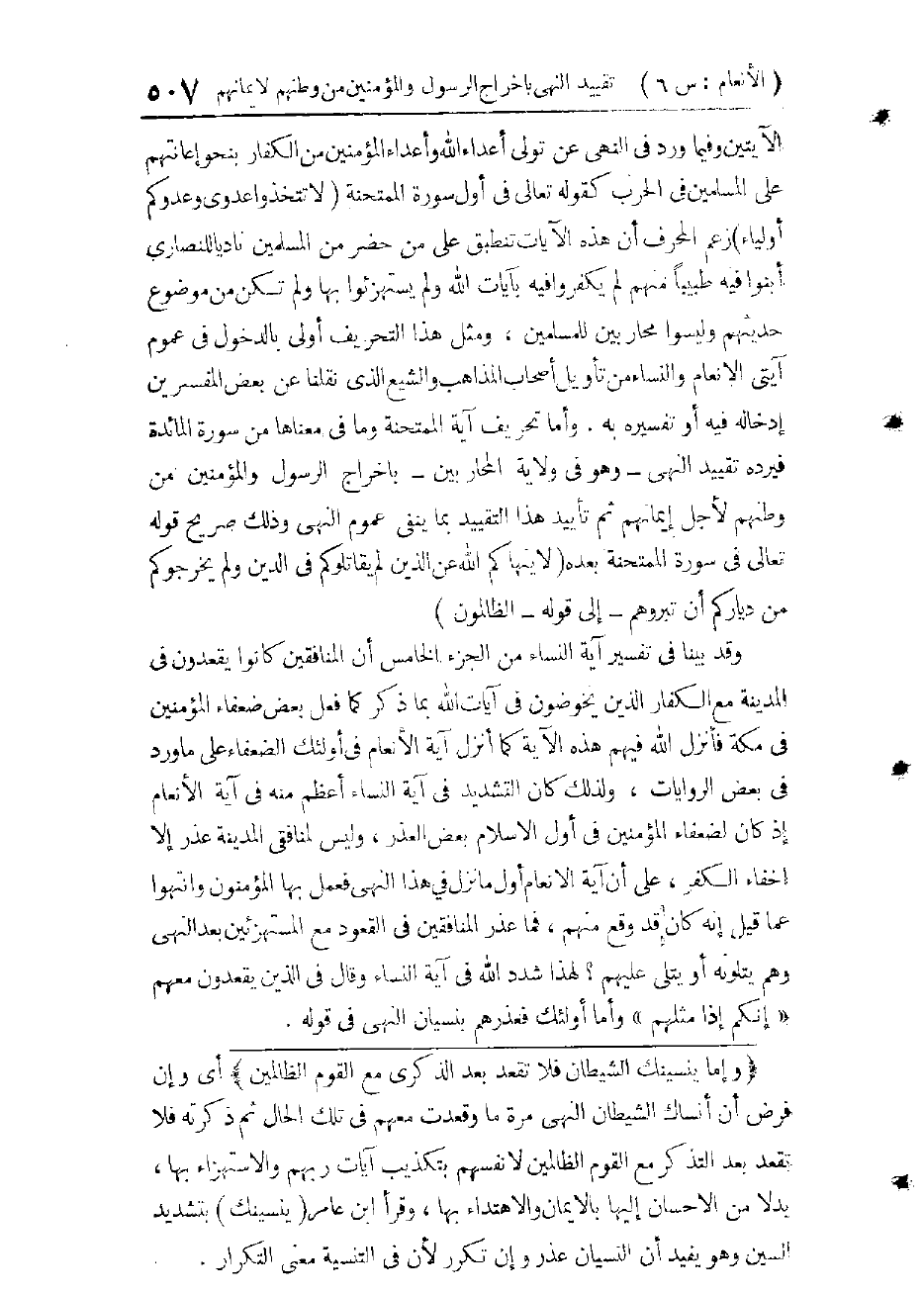 ثُمَّ خَتَمَ اللهُ تَعَالَى هَذَا السِّيَاقَ بِقَوْلِهِ لِرَسُولِهِ - صَلَّى اللَّهُ عَلَيْهِ وَسَلَّمَ - (لَا أَسْأَلُكُمْ عَلَيْهِ أَجْرًا) أَيْ قُلْ أَيُّهَا الرَّسُولُ لِمَنْ بُعِثْتَ إِلَيْهِمْ أَوَّلًا: لَا أَسْأَلُكُمْ عَلَى هَذَا الْقُرْآنِ الَّذِي أُمِرْتُ أَنْ أَدْعُوَكُمْ إِلَيْهِ وَأُذَكِّرَكُمْ بِهِ أَوْ عَلَى التَّبْلِيغِ (وَكُلَاهُمَا) مَفْهُومٌ مِنَ السِّيَاقِ وَإِنْ لَمْ يُذْكُرَا، وَالْمُخْتَارُ الْأَوَّلُ، أَجْرًا مَنْ مَالَ وَلَا غَيْرِهِ مِنَ الْمَنَافِعِ، أَيْ كَمَا أَنَّ جَمِيعَ مَنْ قَبْلِي مِنَ الرُّسُلِ لَمْ يَسْأَلُوا أَقْوَامَهُمْ أَجْرًا عَلَى التَّبْلِيغِ وَالْهُدَى - وَذَلِكَ مُصَرَّحٌ بِهِ فِي قِصَصِهِمْ مِنْ سُورَةِ هُودٍ وَسُورَةِ الشُّعَرَاءِ وَغَيْرِهِمَا، وَقَدْ قِيلَ إِنَّ هَذَا مِمَّا أَمَرَ أَنْ يُقْتَدَى بِهِمْ فِيهِ، وَالتَّحْقِيقُ أَنَّ مَا أَمَرَهُ اللهُ تَعَالَى بِهِ اسْتِقْلَالًا لَا يَدْخُلُ فِيمَا أُمِرَ بِفِعْلِهِ اقْتِدَاءً كَمَا تَقَدَّمَ بَيَانُهُ، وَقَدْ تَكَرَّرَ هَذَا الْأَمْرُ لَهُ - صَلَّى اللَّهُ عَلَيْهِ وَسَلَّمَ - فِي عِدَّةِ سُوَرٍ، وَهُوَ عَلَى عُمُومِهِ، وَالِاسْتِثْنَاءُ فِي قَوْلِهِ تَعَالَى: (قُلْ لَا أَسْأَلُكُمْ عَلَيْهِ أَجْرًا إِلَّا الْمَوَدَّةَ فِي الْقُرْبَى) 42: 23 مُنْقَطِعٌ وَمَعْنَاهُ عَلَى مَا رَوَاهُ أَحْمَدُ وَالشَّيْخَانِ وَالتِّرْمِذِيُّ وَغَيْرُهُمْ عَنِ ابْنِ عَبَّاسٍ: إِلَّا أَنْ تَصِلُوا مَا بَيْنِي وَبَيْنَكُمْ مِنَ الْقَرَابَةِ، وَيُوَضِّحُهُ قَوْلُهُ فِي رِوَايَةٍ لِابْنِ جَرِيرٍ وَابْنِ الْمُنْذِرِ وَابْنِ أَبِي حَاتِمٍ وَالطَّبَرَانِيِّ عَنْهُ قَالَ: كَانَ لِرَسُولِ اللهِ - صَلَّى اللهُ