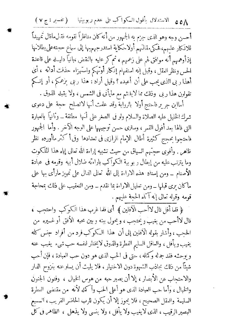 الْإِيمَانَ، وَبَعْضُهُمْ بِغَيْرِ ذَلِكَ، وَاحْتَجَّ بِهَا بَعْضُ الْجَبْرِيَّةِ فِي الظَّاهِرِ وَالْبَاطِنِ مَعًا، وَبَعْضُ الْأَشْعَرِيَّةِ الَّذِينَ يَعْتَقِدُونَ الْجَبْرَ وَيُقِيمُونَ الْحُجَجَ لِإِثْبَاتِهِ وَيَتَبَرَّءُونَ مِنْ لَفْظِهِ وَالِانْتِسَابِ إِلَى أَهْلِهِ - احْتَجَّ كُلٌّ مِنْهُمَا بِأَنَّهَا نَصٌّ فِي مَذْهَبِهِ. وَقَدْ تَفَلْسَفَ الرَّازِيُّ فِي الِاسْتِدْلَالِ عَلَى أَنَّ تَزْيِينَ الْكُفْرِ بِخَلْقِ اللهِ تَعَالَى مِنْ غَيْرِ اخْتِيَارٍ لِلْعَبْدِ، فَزَعَمَ أَنَّ الْإِنْسَانَ لَا يَخْتَارُ الْكُفْرَ وَالْجَهْلَ ابْتِدَاءً مَعَ الْعِلْمِ لِكَوْنِهِ كُفْرًا وَجَهْلًا، وَإِنَّمَا يَخْتَارُهُ لِاعْتِقَادِهِ كَوْنَهُ إِيمَانًا وَعِلْمًا وَصِدْقًا وَحَقًّا، فَلَوْلَا سَابِقَةُ الْجَهْلِ الْأَوَّلِ لَمَا اخْتَارَ هَذَا الْجَهْلَ الثَّانِي، وَذَلِكَ الْجَهْلُ السَّابِقُ إِنْ كَانَ اخْتِيَارِيًّا يُقَالُ فِيهِ مِثْلُ مَا قِيلَ فِيمَا قَبْلَهُ فَيَلْزَمُ التَّسَلْسُلُ الْمُحَالُ، وَقَالَ: " لَمَّا كَانَ ذَلِكَ بَاطِلًا وَجَبَ انْتِهَاءُ تِلْكَ الْجَهَالَاتِ إِلَى جَهْلٍ أَوَّلٍ يَخْلُقُهُ اللهُ تَعَالَى فِيهِ ابْتِدَاءً، وَهُوَ بِسَبَبِ ذَلِكَ الْجَهْلِ ظَنَّ فِي الْكُفْرِ كَوْنَهُ إِيمَانًا وَحَقًّا وَعِلْمًا وَصِدْقًا، فَثَبَتَ أَنَّهُ يَسْتَحِيلُ مِنَ الْكَافِرِ اخْتِيَارُ الْجَهْلِ فِي قَلْبِهِ " اهـ. وَيُبْطِلُ هَذَا الدَّلِيلَ الَّذِي سَمَّاهُ قَطْعِيًّا أَنَّ الْجَهْلَ أَمْرٌ سَلْبِيٌّ لَا يُوصَفُ بِأَنَّهُ خَلْقٌ ابْتِدَائِيٌّ، وَأَنَّهُ لَيْسَ كُلُّ كُفْرٍ مُزَيَّنًا لِصَاحِبِهِ بِاعْتِقَادِهِ أَنَّهُ حَقٌّ وَعِلْمٌ وَصِدْقٌ كَمَا زَعَمَ بَلْ شَرُّ الْكُفْرِ وَأَشَدُّهُ كُفْرُ الْجُحُودِ وَالْعِنَادِ وَالْمُكَابَرَةِ، وَإِنَّمَا يُزَيِّنُهُ الشَّيْطَانُ لِصَاحِبِهِ بِعَدِّهِ مِنْ عِزَّةِ النَّفْسِ وَشَرَفِهَا، بِالِامْتِنَاعِ مِنِ اعْتِرَافِهَا بِمَا تَرَاهُ عَارًا عَلَيْهَا وَعَلَى الْآبَاءِ وَالْأَجْدَادِ بِاتِّبَاعِ مَنْ هُوَ دُونَهَا فِي الشَّرَفِ وَالْجَاهِ كَمَا عُرِفَ مِنْ شَأْنِ الْجَادِّينَ، مِنْ رُؤَسَاءِ الْأُمَمِ الْمُتْرَفِينَ، مَعَ الْأَنْبِيَاءِ الْمُرْسَلِينَ، وَوَرِثَتِهِمْ مِنَ الْعُلَمَاءِ الْمُصْلِحِينَ.
