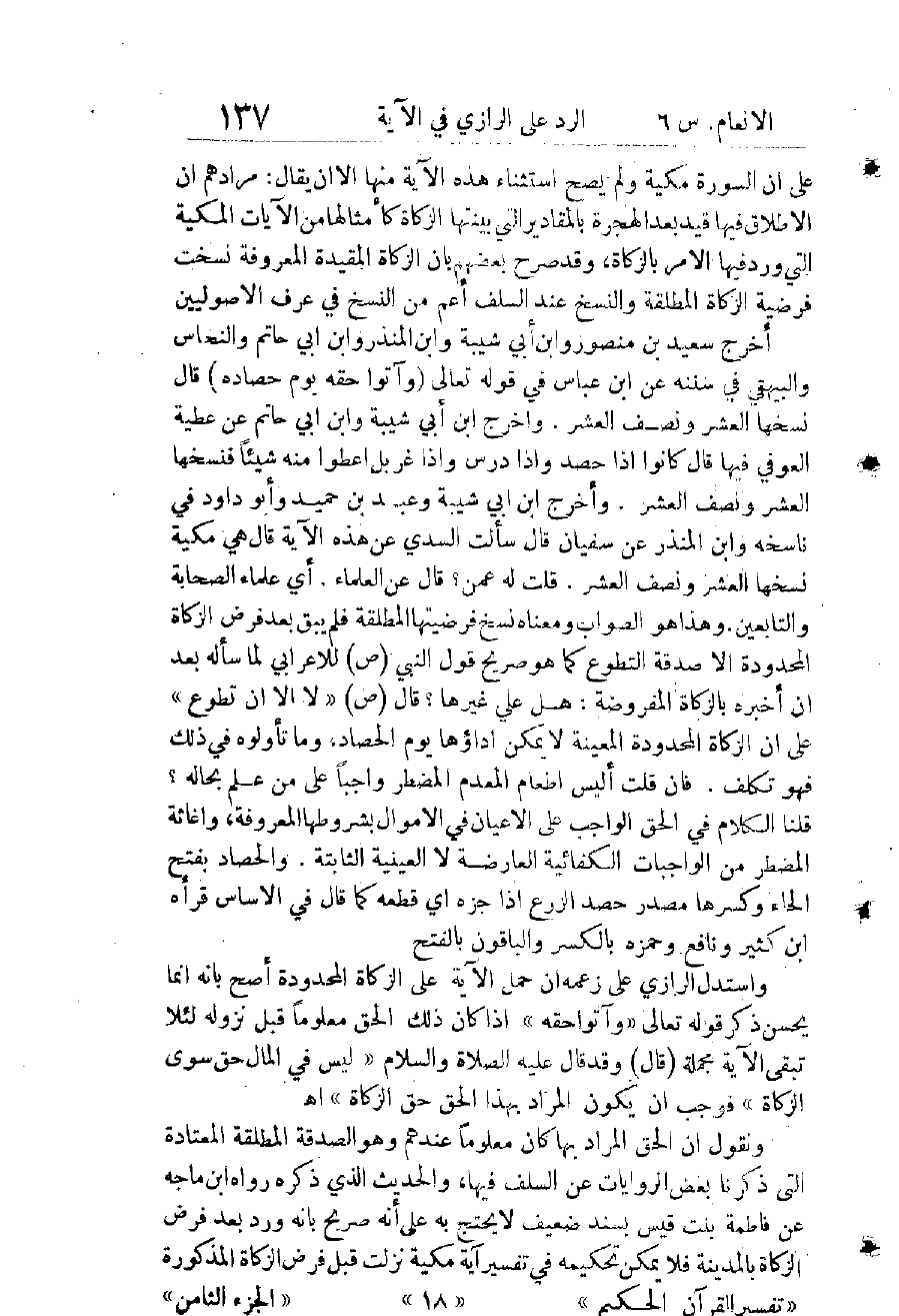 وَأَمَّا جَوَابُهُمْ عَنِ الْآيَةِ بِأَنَّهَا مَكِّيَّةٌ بَيَّنَتْ مَا كَانَ مُحَرَّمًا وَقْتَ نُزُولِهَا وَلَيْسَ فِيهَا مَا يَمْنَعُ تَحْرِيمَ غَيْرِهِ بَعْدَهَا كَتَحْرِيمِ الْحُمُرِ وَالْمُنْخَنِقَةِ وَالْمَوْقُوذَةِ إِلَخْ. فَهُوَ غَفْلَةٌ وَقَعَ فِيهَا كَثِيرٌ مِنَ الْحُفَّاظِ وَالْمُفَسِّرِينَ وَالْفُقَهَاءِ وَجَلَّ مَنْ لَا يَنْسَى وَلَا يُخْطِئُ.