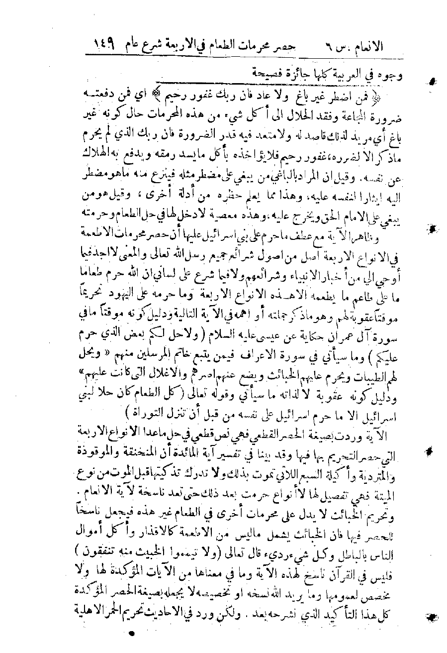 وَأَمَّا حِكْمَةُ التَّشْرِيعِ فِي دِينٍ عَامٍّ يُطَالِبُ جَمِيعَ الْبَشَرِ فِي جَمِيعِ الْأَقْطَارِ بِالِاهْتِدَاءِ بِهِ فَهِيَ مَأْخُوذَةٌ مِمَّا وَرَدَ مِنْ يُسْرِ شَرِيعَتِهِ وَعَدَمِ إِعْنَاتِهَا لِلْبَشَرِ، وَمَبْنِيَّةٌ عَلَى بُلُوغِ هَذَا النَّوْعِ فِي جُمْلَتِهِ دَرَجَةَ الرُّشْدِ الَّذِي يَسْتَقِلُّ بِهِ فِي شُئُونِ حَيَاتِهِ الْمَعَاشِيَّةِ وَالْمَعَادِيَةِ فَلَا تُقَيِّدُهُ فِيهَا إِلَّا بِمَا يَزِيدُ فِي الصَّلَاحِ وَالتَّقْوَى وَتَزْكِيَةِ الْأَنْفُسِ وَلَيْسَ فِي تَحْرِيمِ مَا حَرَّمُوهُ مِنْ غَيْرِ الْأَنْوَاعِ الْأَرْبَعَةِ الَّتِي فِي الْآيَةِ شَيْءٌ مِنْ ذَلِكَ.