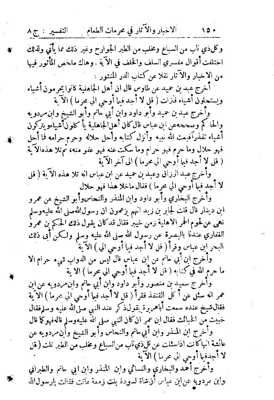 إِذَا ثَبَتَ هَذَا فَنَقُولُ: قَوْلُهُ تَعَالَى: (وَعَلَى الَّذِينَ هَادُوا حَرَّمْنَا كُلَّ ذِي ظُفُرٍ) يُفِيدُ تَخْصِيصَ هَذِهِ الْحُرْمَةِ بِهِمْ مِنْ وَجْهَيْنِ: (الْأَوَّلُ) أَنَّ قَوْلَهُ: وَعَلَى الَّذِينَ هَادُوا حَرَّمْنَا كَذَا وَكَذَا يُفِيدُ الْحَصْرَ فِي اللُّغَةِ (وَالثَّانِي) أَنَّهُ لَوْ كَانَتْ هَذِهِ الْحُرْمَةُ ثَابِتَةً فِي حَقِّ الْكُلِّ لَمْ يَبْقَ لِقَوْلِهِ: (وَعَلَى الَّذِينَ هَادُوا حَرَّمْنَا) فَائِدَةٌ - فَثَبَتَ أَنَّ تَحْرِيمَ السِّبَاعِ وَذِي الْمِخْلَبِ مِنَ الطَّيْرِ مُخْتَصٌّ بِالْيَهُودِ فَوَجَبَ أَلَّا تَكُونَ مُحَرَّمَةً عَلَى الْمُسْلِمِينَ. وَعِنْدَ هَذَا نَقُولُ: مَا رُوِيَ أَنَّهُ صَلَّى اللَّهُ عَلَيْهِ وَسَلَّمَ حَرَّمَ كُلَّ ذِي نَابٍ مِنَ السِّبَاعِ، وَذِي مِخْلَبٍ مِنَ الطُّيُورِ، ضَعِيفٌ لِأَنَّهُ خَبَرٌ وَاحِدٌ عَلَى خِلَافِ كِتَابِ اللهِ تَعَالَى، فَوَجَبَ أَلَّا يَكُونَ مَقْبُولًا وَعَلَى هَذَا التَّقْدِيرِ يَقْوَى قَوْلُ مَالِكٍ فِي هَذِهِ الْمَسْأَلَةِ اهـ.