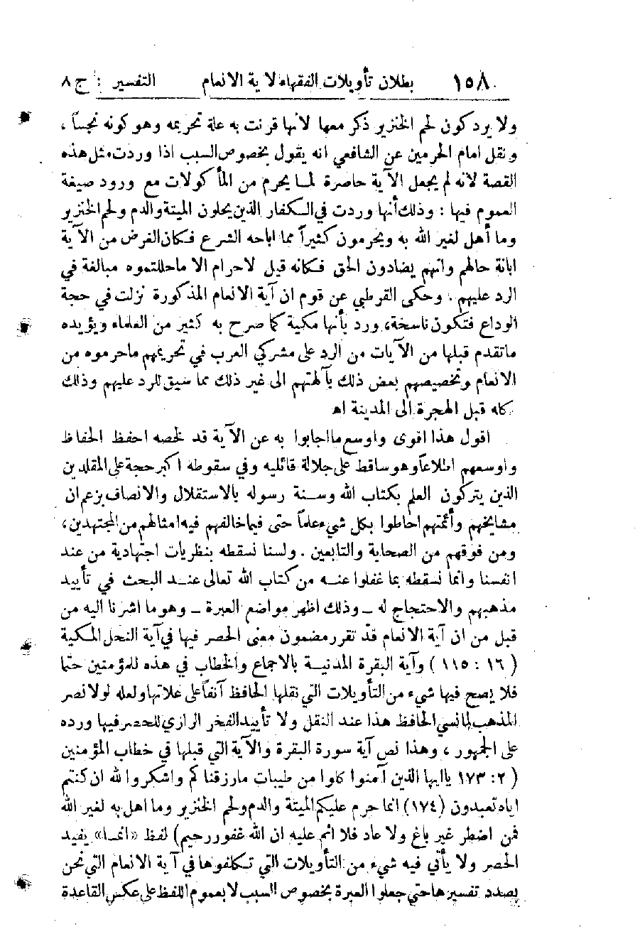 أُرِيدَ بِهِ بَاطِلٌ، وَاسْتَدَلَّ عَلَى ذَلِكَ بِتَشْبِيهِهِ تَعَالَى تَكْذِيبَهُمْ بِتَكْذِيبِ مَنْ كَانَ قَبْلَهُمْ مِنَ الْمُشْرِكِينَ لِرُسُلِ اللهِ إِلَيْهِمْ، وَمَا جَاءُوهُمْ بِهِ مِنَ التَّوْحِيدِ وَإِنْكَارِ الشِّرْكِ، وَمَا لَمْ يَأْذَنِ اللهُ بِهِ مِنَ الشَّرْعِ فِي التَّحْلِيلِ وَالتَّحْرِيمِ وَالْعِبَادَةِ وَغَيْرِ ذَلِكَ. وَلَكِنَّ عِبَارَتَهُ فِي هَذَا الْمَقَامِ مُضْطَرِبَةٌ لَيْسَتْ كَسَائِرِ عِبَارَاتِهِ فِي الْجَلَاءِ. وَقَدْ قَالَ فِي آخِرِهَا أَنَّ لَهَا عِنْدَهُ عِلَلًا أُخْرَى غَيْرَ مَا ذَكَرَهُ يَطُولُ بِذِكْرِهَا الْكِتَابُ (قَالَ) : " وَفِيمَا ذَكَرْنَاهُ كِفَايَةٌ لِمَنْ وُفِّقَ لِفَهْمِهِ " وَمَا قَالَ هَذَا إِلَّا مِنْ شُعُورٍ بِضِعْفِ الْعِبَارَةِ وَأَنَّهَا لَا تَكَادُ تُفْهَمُ بِسُهُولَةٍ.