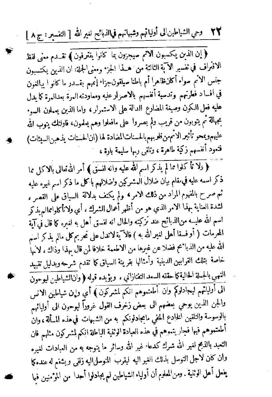 " وَأَمَّا الذَّبْحُ لِلسُّلْطَانِ وَهَلْ هُوَ دَاخِلٌ فِي عُمُومِ مَا أُهِلَّ بِهِ لِغَيْرِ اللهِ أَمْ لَا؟ فَقَدْ أَجَابَ الْمَاتِنُ رَحِمَهُ اللهُ فِي بَحْثٍ لَهُ عَلَى ذَلِكَ بِمَا لَفْظُهُ: اعْلَمْ أَنَّ الْأَصْلَ الْحِلُّ كَمَا صَرَّحَتْ بِهِ الْعُمُومَاتُ الْقُرْآنِيَّةُ وَالْحَدِيثِيَّةُ، فَلَا يُحْكَمُ بِتَحْرِيمِ فَرْدٍ مِنَ الْأَفْرَادِ أَوْ نَوْعٍ مِنَ الْأَنْوَاعِ إِلَّا بِدَلِيلٍ يَنْقُضُ ذَلِكَ الْأَصْلَ الْمَعْلُومَ مِنَ الشَّرِيعَةِ الْمُطَهَّرَةِ، مِثْلُ تَحْرِيمِ مَا ذُبِحَ عَلَى النُّصُبِ وَالْمَيْتَةِ وَالْمُتَرَدِّيَةِ وَالنَّطِيحَةِ وَالْمَوْقُوذَةِ وَمَا أُهِلَّ بِهِ لِغَيْرِ اللهِ وَلَحْمِ الْخِنْزِيرِ، وَكُلِّ شَيْءٍ خَرَجَ مِنْ ذَلِكَ الْأَصْلِ بِدَلِيلٍ مِنَ الْكِتَابِ أَوِ السُّنَّةِ الْمُطَهَّرَةِ كَتَحْرِيمِ كُلِّ ذِي نَابٍ مِنَ السِّبَاعِ وَمِخْلَبٍ مِنَ الطَّيْرِ وَتَحْرِيمِ الْحُمُرِ الْإِنْسِيَّةِ. وَقَدْ ذَهَبَ جَمَاعَةٌ مِنْ أَهْلِ الْعِلْمِ إِلَى أَنَّ أُصُولَ التَّحْرِيمِ الْكِتَابُ وَالسُّنَّةُ وَالْإِجْمَاعُ وَالْقِيَاسُ، أَوْ وُقُوعُ الْأَمْرِ بِالْقَتْلِ أَوِ النَّهْيِ عَنْهُ أَوِ الِاسْتِخْبَاثِ أَوِ التَّحْرِيمِ عَلَى الْأُمَمِ السَّالِفَةِ - إِذَا لَمْ يُنْسَخْ - فَلَا بُدَّ لِلْقَائِلِ بِتَحْرِيمِ فَرْدٍ مِنَ الْأَفْرَادِ أَوْ نَوْعٍ مِنَ الْأَنْوَاعِ مِنِ انْدِرَاجِهِ تَحْتَ أَصْلٍ مِنْ هَذِهِ الْأُصُولِ، فَإِنْ تَعَذَّرَ عَلَيْهِ ذَلِكَ فَلَيْسَ لَهُ أَنْ يَتَقَوَّلَ عَلَى اللهِ مَا لَمْ يَقُلْ، فَإِنَّ مَنْ حَرَّمَ مَا أَحَلَّ اللهُ كَمَنْ حَلَّلَ مَا حَرَّمَ اللهُ لَا فَرْقَ بَيْنَهُمَا، وَفِي ذَلِكَ مِنَ الْإِثْمِ مَا لَا يَخْفَى عَلَى عَارِفٍ، وَلَا شَكَّ