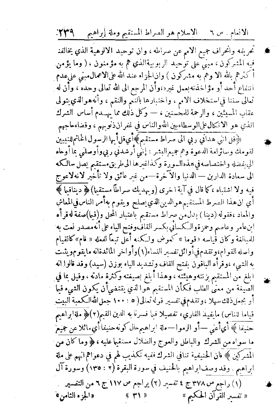 وَالْكَافِرِينَ، وَآيَاتِ اللهِ وَحُجَجِهِ عَلَى الْعَالَمِينَ، وَإِنَّمَا ذُكِرَ فِيهَا مِنْ قَصَصِ الرُّسُلِ عَلَيْهِمُ السَّلَامُ مُحَاجَّةُ إِبْرَاهِيمَ لِأَبِيهِ وَقَوْمِهِ فِي التَّوْحِيدِ، وَمَا آتَاهُ اللهُ مِنَ الْحُجَّةِ عَلَيْهِمْ لِمَا بَيَّنَاهُ مِنْ حِكْمَةِ ذَلِكَ، وَذُكِرَ فِيهَا مُوسَى وَالتَّوْرَاةُ لِلشَّبَهِ بَيْنَ رِسَالَتِهِ وَكِتَابِهِ وَبَيْنَ رِسَالَةِ مُحَمَّدٍ وَكِتَابِهِ عَلَيْهِمَا السَّلَامُ كَمَا شَرَحْنَاهُ فِي مَحَلِّهِ، وَمِنْهُ وَصَايَا الْقُرْآنِ الْعَشْرُ وَوَصَايَا التَّوْرَاةِ الْعَشْرُ، وَذُكِرَ فِيهَا أَيْضًا مَا كَانَ مِنْ حَالِ الرُّسُلِ عَامَّةً مَعَ أَقْوَامِهِمُ الْمُشْرِكِينَ لِأَجْلِ الْعِبْرَةِ وَتَسْلِيَةِ خَاتَمِ الرُّسُلِ صَلَّى الله عَلَيْهِ وَآلِهِ وَعَلَيْهِمْ أَجْمَعِينَ. وَإِنَّنَا بَعْدَ هَذَا الْإِجْمَالِ نُذَكِّرُ الْقُرَّاءَ بِبَعْضِ الْأُصُولِ الَّتِي يَغْفَلُ الْكَثِيرُونَ عَنْ جُمْلَتِهَا وَفَوَائِدِ الْجَمْعِ بَيْنَهَا.