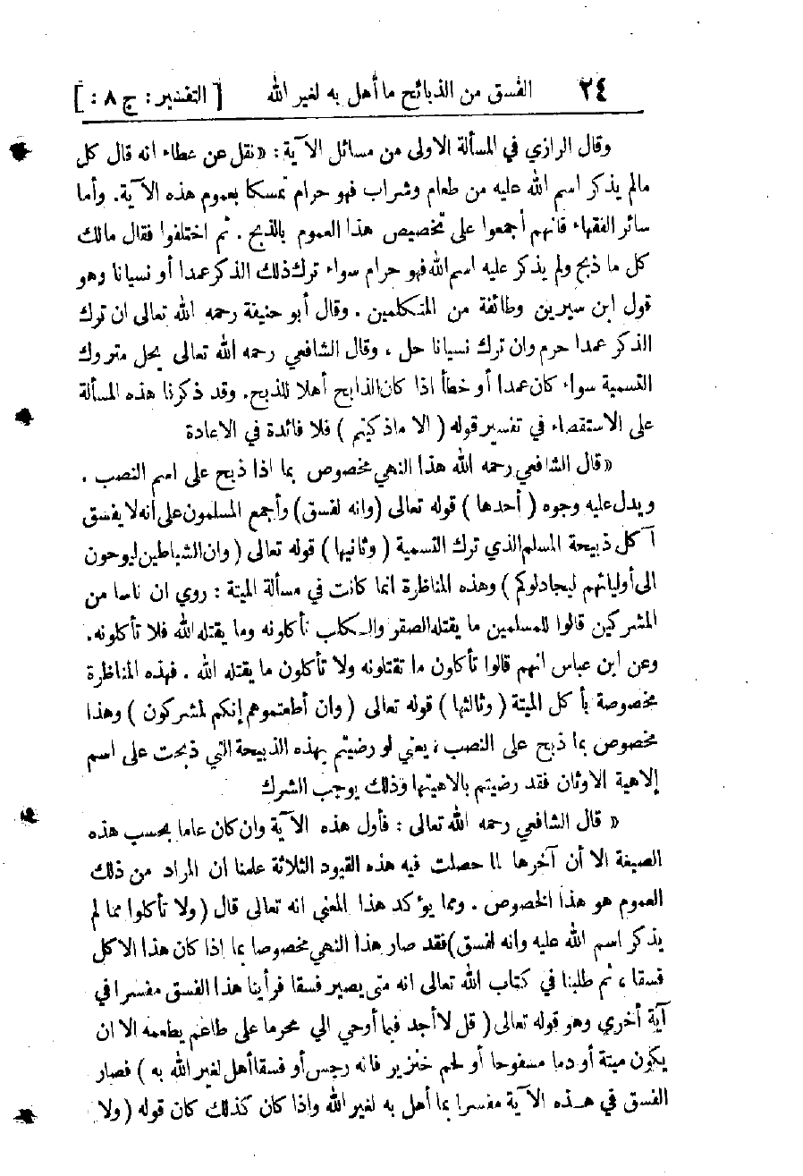 بِاسْمِ اللهِ وَاسْمِ مُحَمَّدٍ أَوْ مُحَمَّدٍ رَسُولِ اللهِ صَلَّى اللَّهُ عَلَيْهِ وَسَلَّمَ - بِجَرِّ اسْمِ الثَّانِي - أَوْ مُحَمَّدٍ إِنْ عُرِفَ النَّحْوُ فِيمَا يَظْهَرُ، أَوْ أَنْ يَذْبَحَ كِتَابِيٌّ لِكَنِيسَةٍ أَوْ لِصَلِيبٍ أَوْ لِمُوسَى أَوْ لِعِيسَى أَوْ مُسْلِمٌ لِلْكَعْبَةِ أَوْ لِمُحَمَّدٍ صَلَّى الله عَلَيْهِ وَآلِهِ وَسَلَّمَ، أَوْ تَقَرُّبًا لِسُلْطَانٍ أَوْ غَيْرِهِ أَوْ لِلْجِنِّ فَهَذَا كُلُّهُ يُحَرِّمُ الْمَذْبُوحَ وَهُوَ كَبِيرَةٌ قَالَ: وَمَعْنَى مَا أُهِلَّ بِهِ لِغَيْرِ اللهِ مَا ذُبِحَ لِلطَّوَاغِيتِ وَالْأَصْنَامِ قَالَهُ جَمْعٌ. وَقَالَ آخَرُونَ: يَعْنِي مَا ذُكِرَ عَلَيْهِ غَيْرُ اسْمِ اللهِ. قَالَ الْفَخْرُ الرَّازِيُّ: وَهَذَا الْقَوْلُ أَوْلَى لِأَنَّهُ أَشَدُّ مُطَابَقَةً لِلَفْظِ الْآيَةِ. قَالَ الْعُلَمَاءُ: " لَوْ ذَبَحَ مُسْلِمٌ ذَبِيحَةً وَقَصَدَ بِذَبْحِهِ التَّقَرُّبَ بِهَا إِلَى غَيْرِ اللهِ تَعَالَى صَارَ مُرْتَدًّا وَذَبِيحَتُهُ ذَبِيحَةُ مُرْتَدٍّ ". انْتَهَى كَلَامُ الزَّوَاجِرِ، وَقَالَ صَاحِبُ الرَّوْضِ: إِنَّ الْمُسْلِمَ إِذَا ذَبَحَ لِلنَّبِيِّ صَلَّى اللَّهُ عَلَيْهِ وَسَلَّمَ كَفَرَ، انْتَهَى، قَالَ الشَّوْكَانِيُّ فِي الدُّرِّ النَّضِيدِ: وَهَذَا الْقَائِلُ مِنْ أَئِمَّةِ الشَّافِعِيَّةِ وَإِذَا كَانَ الذَّبْحُ لِسَيِّدِ الرُّسُلِ صَلَّى اللَّهُ عَلَيْهِ وَسَلَّمَ كُفْرًا عِنْدَهُ فَكَيْفَ الذَّبْحُ لِسَائِرِ الْأَمْوَاتِ؟ انْتَهَى.