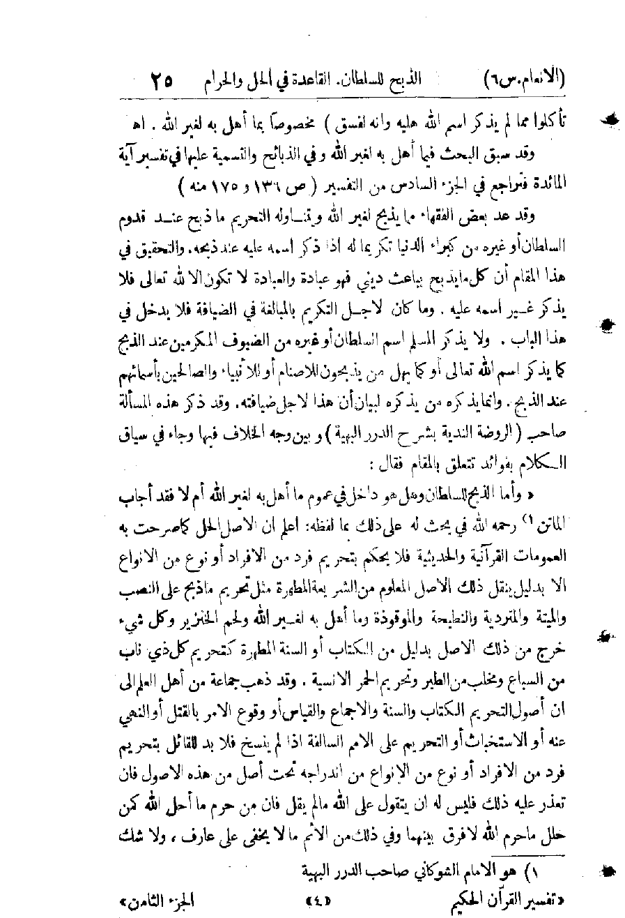 انْتَهَى. قَالَ الزَّمَخْشَرِيُّ: كَانُوا إِذَا اشْتَرَوْا دَارًا أَوْ بَنَوْهَا أَوِ اسْتَخْرَجُوا عَيْنًا ذَبَحُوا ذَبِيحَةً خَوْفًا أَنْ تُصِيبَهُمُ الْجِنُّ فَأُضِيفَتْ إِلَيْهِمُ الذَّبَائِحُ لِذَلِكَ. انْتَهَى كَلَامُ فَتْحِ الْمَجِيدِ. وَقَدْ نَقَلَ الشَّوْكَانِيُّ أَيْضًا الْعَبَّارَةَ الْمُتَقَدِّمَةَ لِشَيْخِ الْإِسْلَامِ فِي رِسَالَتِهِ (الدُّرُّ النَّضِيدُ) وَاسْتَدَلَّ بِهِ عَلَى تَحْرِيمِ مَا ذُبِحَ لِغَيْرِ اللهِ تَعَالَى سَوَاءٌ لَفَظَ بِهِ الذَّابِحُ عِنْدَ الذَّبْحِ أَوْ لَمْ يَلْفِظْ وَهَذَا هُوَ الْحَقُّ. انْتَهَى كَلَامُ الرَّوْضَةِ النَّدِيَّةِ.