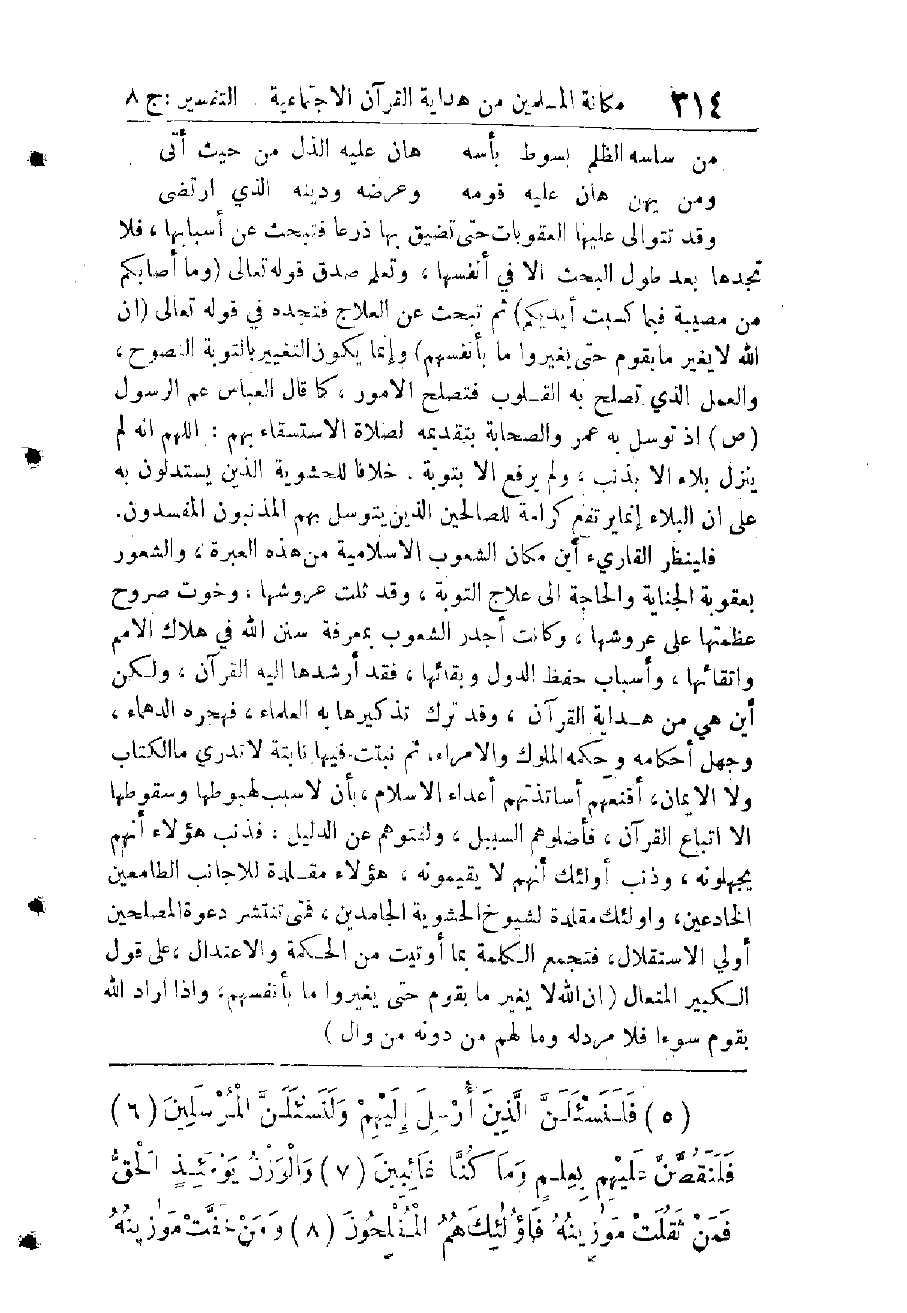 إِلَى الْحَقِّ وَالْخَيْرِ، وَبِالْأَرْوَاحِ الشَّيْطَانِيَّةِ الَّتِي تَجْذِبُهَا إِلَى الْبَاطِلِ وَالشَّرِّ، وَأَنَّ عَاقِبَةَ التَّأَثُّرِ الْأَوَّلِ سَعَادَةُ الدَّارَيْنِ بِمَا تَقْبَلُهُ طَبِيعَةُ كُلٍّ مِنْهُمَا، وَعَاقِبَةُ الثَّانِي شَقَاءُ الدَّارَيْنِ بِقَدْرِ مَا يُوجَدُ مِنْ أَسْبَابِ الشَّقَاءِ فِيهِمَا، وَيَحْتَاجُ الْبَشَرُ فِي ذَلِكَ إِلَى هِدَايَةِ الْوَحْيِ الْإِلَهِيِّ الْهَادِيَةِ إِلَى اتِّقَاءِ الْأَوَّلِ وَالتَّعَرُّضِ لِلْآخَرِ، وَهُوَ مَا بَيَّنَهُ تَعَالَى فِي سُورَةِ طَهَ بِقَوْلِهِ: (قَالَ اهْبِطَا مِنْهَا جَمِيعًا بَعْضُكُمْ لِبَعْضٍ عَدُوٌّ فَإِمَّا يَأْتِيَنَّكُمْ مِنِّي هَدًى فَمَنِ اتَّبَعَ هُدَايَ فَلَا يَضِلُّ وَلَا يَشْقَى وَمَنْ أَعْرَضَ عَنْ ذِكْرِي فَإِنَّ لَهُ مَعِيشَةً ضَنْكًا وَنَحْشُرُهُ يَوْمَ الْقِيَامَةِ أَعْمَى قَالَ رَبِّ لِمَ حَشَرْتَنِي أَعْمَى وَقَدْ كُنْتُ بَصِيرًا قَالَ كَذَلِكَ أَتَتْكَ آيَاتُنَا فَنَسِيتَهَا وَكَذَلِكَ الْيَوْمَ تُنْسَى) (20: 123 - 126) وَنَحْوِهِ مَا تَقَدَّمَ فِي سُورَةِ الْبَقَرَةِ، فَهَذَا أَثَرُ الدِّينِ فِي الْحِفْظِ مِنْ شَقَاءِ الدُّنْيَا وَهَلَاكِ الْآخِرَةِ، وَكِتَابُ اللهِ حُجَّةٌ عَلَى مَنْ لَا يُصَدِّقُ عَلَيْهِمْ ذَلِكَ فِي حَالِهِمْ، وَمَنْ يُفَسِّرُونَهُ بِمَا يُخَالِفُ ذَلِكَ بِأَقْوَالِهِمْ.