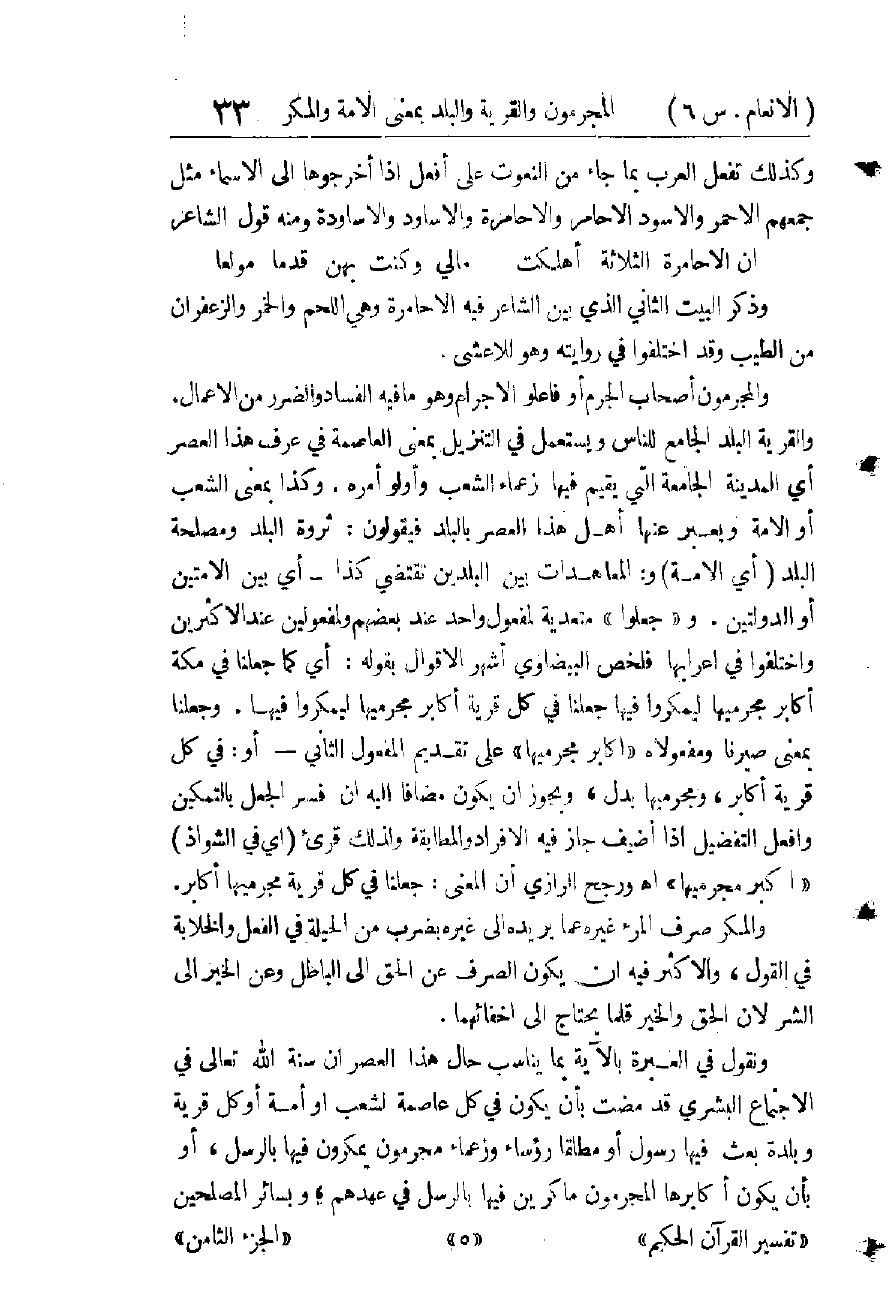 بِمَكْرِ زُعَمَائِهَا الْمُجْرِمِينَ، وَهَذِهِ الْقَاعِدَةُ تَنْطَبِقُ أَتَمَّ الِانْطِبَاقِ عَلَى جَمْهَرَةِ أَكَابِرِ مَكَّةَ، وَبِذَلِكَ يَكُونُ التَّنَاسُبُ وَالِاتِّصَالُ بَيْنَ هَذِهِ الْآيَاتِ