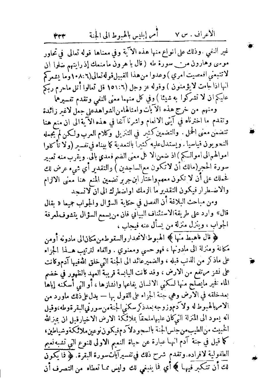 لِعَدَمِ الرَّدِّ غَيْرُ صَحِيحٍ؛ فَقَدْ رَدَّ تَعَالَى عَلَيْهِمْ بِمِثْلِ قَوْلِهِ: (أَوَلَوْ كَانَ آبَاؤُهُمْ لَا يَعْقِلُونَ شَيْئًا وَلَا يَهْتَدُونَ) (2: 170) وَالصَّوَابُ أَنَّهُ اسْتَغْنَى عَنِ الرَّدِّ الصَّحِيحِ هُنَا بِرَدِّ مَا اقْتَرَنَ بِهِ الْمُتَضَمِّنُ لِلرَّدِّ عَلَيْهِ وَبَيَانِ بُطْلَانِهِ وَهُوَ زَعْمُهُمْ أَنَّ اللهَ تَعَالَى أَمَرَهُمْ بِتِلْكَ الْفَحْشَاءِ الَّتِي وَجَدُوا عَلَيْهَا آبَاءَهُمْ، فَقَدْ أَمَرَ اللهُ تَعَالَى رَسُولَهُ صَلَّى اللَّهُ عَلَيْهِ وَسَلَّمَ بِأَنْ يَدْحَضَهُ بِقَوْلِهِ لَهُمْ: (قُلْ إِنَّ اللهَ لَا يَأْمُرُ بِالْفَحْشَاءِ أَتَقُولُونَ عَلَى اللهِ مَا لَا تَعْلَمُونَ) فَهَذَا الْقَوْلُ تَكْذِيبٌ لَهُمْ مِنْ طَرِيقَيِ الْعَقْلِ وَالنَّقْلِ، أَمَّا الْأَوَّلُ فَتَقْرِيرُهُ أَنَّ هَذَا الْفِعْلَ لَا خِلَافَ بَيْنَكُمْ وَبَيْنَنَا فِي أَنَّهُ مِنَ الْفَحْشَاءِ أَيْ أَقْبَحِ الْقَبَائِحِ، وَاللهُ تَعَالَى مُنَزَّهٌ بِكَمَالِهِ الْمُطْلَقِ الَّذِي لَا شَائِبَةَ لِلنَّقْصِ فِيهِ أَنْ يَأْمُرَ بِالْفَحْشَاءِ، وَإِنَّمَا الَّذِي يَأْمُرُ بِهَا هُوَ الشَّيْطَانُ الَّذِي هُوَ مَجْمَعُ النَّقَائِصِ كَمَا قَالَ تَعَالَى فِي آيَةٍ أُخْرَى: (الشَّيْطَانُ يَعِدُكُمُ الْفَقْرَ وَيَأْمُرُكُمْ بِالْفَحْشَاءِ) (2: 268) وَهَذَا حُجَّةٌ عَلَى مَنْ يُنْكِرُ الْحُسْنَ وَالْقُبْحَ الْعَقْلِيَّ فِي الْأَحْكَامِ الشَّرْعِيَّةِ لِأَجْلِ مُخَالَفَةِ مَنْ تَوَسَّعُوا فِي تَحْكِيمِ الْعَقْلِ فِي ذَلِكَ، وَأَمَّا طَرِيقُ النَّقْلِ فَهُوَ أَنَّ مَا يُسْنَدُ إِلَى اللهِ تَعَالَى مِنْ أَمْرٍ وَنَهْيٍ لَا يَثْبُتُ بِمُجَرَّدِ الدَّعْوَى، بَلْ يَجِبُ أَنْ يُعْلَمَ بِوَحْيٍ مِنْهُ تَعَالَى إِلَى رَسُولٍ مِنْ عِنْدِهِ ثَبَتَتْ رِسَالَتُهُ بِتَأْيِيدِهِ تَعَالَى لَهُ بِالْآيَاتِ الْبَيِّنَاتِ فَالِاسْتِفَادَةُ فِي قَوْلِهِ تَعَالَى: (أَتَقُولُونَ عَلَى اللهِ مَا لَا تَعْلَمُونَ) لِلْإِنْكَارِ الْمُتَضَمِّنِ لِلتَّوْبِيخِ، وَلِلرَّدِّ عَلَى الْمُقَلِّدِينَ فَإِنَّهُمْ بِاتِّبَاعِ آبَائِهِمْ وَأَجْدَادِهِمْ وَشُيُوخِهِمْ فِي آرَائِهِمْ وَأَعْمَالِهِمُ الدِّينِيَّةِ غَيْرِ الْمُسْنَدَةِ إِلَى الْوَحْيِ الْإِلَهِيِّ يَقُولُونَ عَلَى اللهِ مَا لَا يَعْلَمُونَ أَنَّهُ شَرَعَهُ لِعِبَادِهِ.