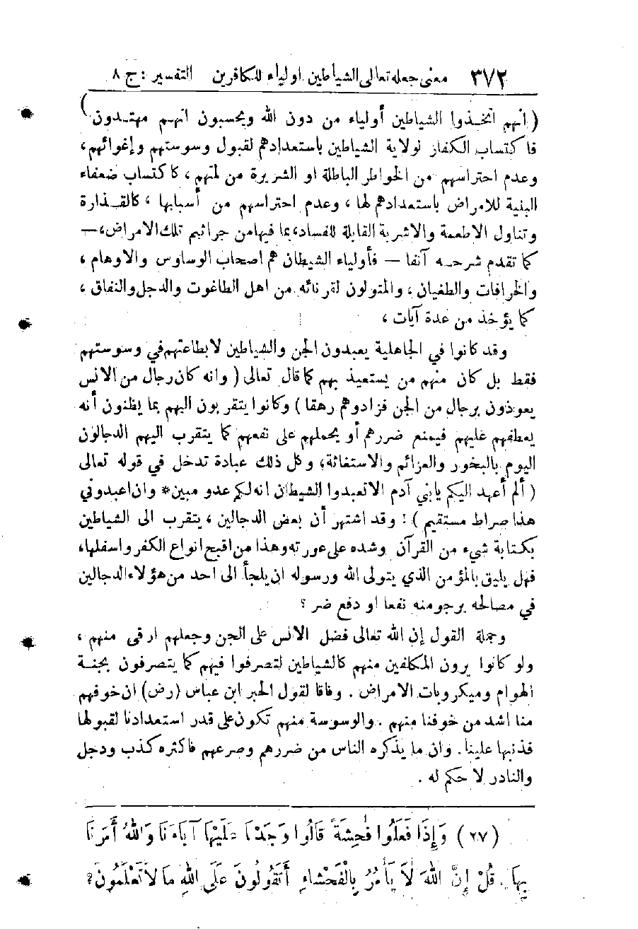 (وَلَا يَدْخُلُونَ الْجَنَّةَ حَتَّى يَلِجَ الْجَمَلُ فِي سَمِّ الْخِيَاطِ) قَرَأَ جُمْهُورُ الْقُرَّاءِ (الْجَمَلُ) بِالتَّحْرِيكِ وَهُوَ الْبَعِيرُ الْبَازِلُ أَيِ الَّذِي طَلَعَ نَابُهُ، وَالْمَعْنَى: لَا يَدْخُلُونَ الْجَنَّةَ حَتَّى يَدْخُلَ مَا هُوَ مَثَلٌ فِي عِظَمِ الْجِرْمِ وَهُوَ الْجَمَلُ الْكَبِيرُ فِيمَا هُوَ مَثَلٌ فِي الضِّيقِ وَهُوَ ثُقْبُ الْإِبْرَةِ - وَتُسَمَّى الْخِيَاطَ بِالْكَسْرِ وَالْمِخْيَطِ بِوَزْنِ الْمِنْبَرِ - وَذَلِكَ لَا يَكُونُ فَالْمُرَادُ تَأْكِيدُ النَّفْيِ أَوْ تَأْيِيدُهُ. وَكَأَنَّ بَعْضَ النَّاسِ فِي الصَّدْرِ الْأَوَّلِ لَمْ يَفْطَنُوا لِنُكْتَةِ هَذَا التَّعْلِيقِ لِعَدَمِ التَّنَاسُبِ بَيْنَ الْجَمَلِ وَسَمِّ الْخِيَاطِ فَكَانُوا يَسْأَلُونَ عَنْهُ فَيُجَابُونَ بِمَا يُؤَكِّدُ الْمُرَادَ. سُئِلَ عَنْهُ ابْنُ مَسْعُودٍ رَضِيَ اللهُ عَنْهُ. فَقَالَ: هُوَ زَوْجُ النَّاقَةِ - وَالْحَسَنُ الْبَصْرِيُّ فَقَالَ: ابْنُ النَّاقَةِ الَّذِي يَقُومُ فِي الْمِرْبَدِ عَلَى أَرْبَعِ قَوَائِمَ.