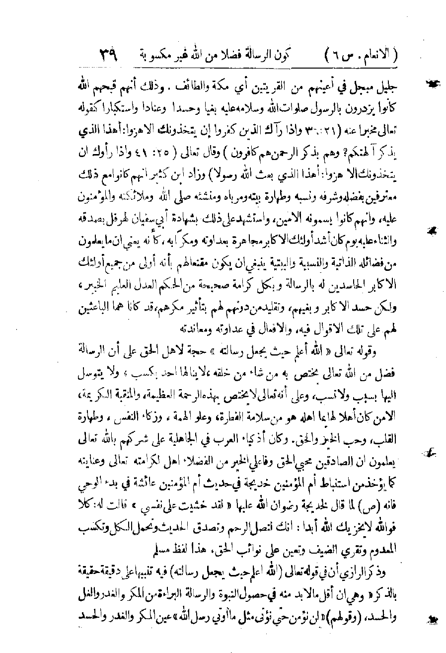 بِقَدَرٍ لَا آنِفًا جَدِيدًا غَيْرَ مُرْتَبِطٍ بِنِظَامٍ سَابِقٍ. وَفِيهِ أَنَّ كُلَّ شَيْءٍ بِإِرَادَتِهِ وَمَشِيئَتِهِ وَأَنَّ مَشِيئَتَهُ مَقْرُونَةٌ بِحِكْمَتِهِ الَّتِي اقْتَضَتِ النِّظَامَ وَالتَّقْدِيرَ، وَتَنَزَّهَ بِهَا عَنِ الْأُنُفِ وَالْجُزَافِ وَالتَّفَاوُتِ وَالْخَلَلِ وَفِيهِ أَنَّ إِيمَانَ الْعَبْدِ الْمُكَلَّفِ يَقَعُ بِفِعْلِهِ وَاخْتِيَارِهِ، وَأَنَّ اللهَ تَعَالَى هُوَ الَّذِي خَلَقَهُ فَاعِلًا بِالْإِرَادَةِ وَالِاخْتِيَارِ ; وَبِهَذَا لَا يَكُونُ فِعْلُهُ وَكَسْبُهُ مُنَافِيًا لِخَلْقِ اللهِ وَمَشِيئَتِهِ، وَلَا جَاعِلًا لَهُ مُسْتَقِلًّا دُونَهُ - تَعَالَى - مُسْتَغْنِيًا عَنْ تَوْفِيقِهِ وَإِمْدَادِهِ فِي كُلِّ حِينٍ حَتَّى يُقَالَ إِنَّهُ جُعِلَ خَالِقًا لِعِلْمِهِ. فَالْفَرْقُ بَيْنَ الْفِعْلَيْنِ عَظِيمٌ، وَبِهَذَا الْجَمْعِ بَيْنَ نُصُوصِ الْوَحْيِ، تَظْهَرُ حُجَّةُ اللهِ الْبَالِغَةُ عَلَى الْخَلْقِ.