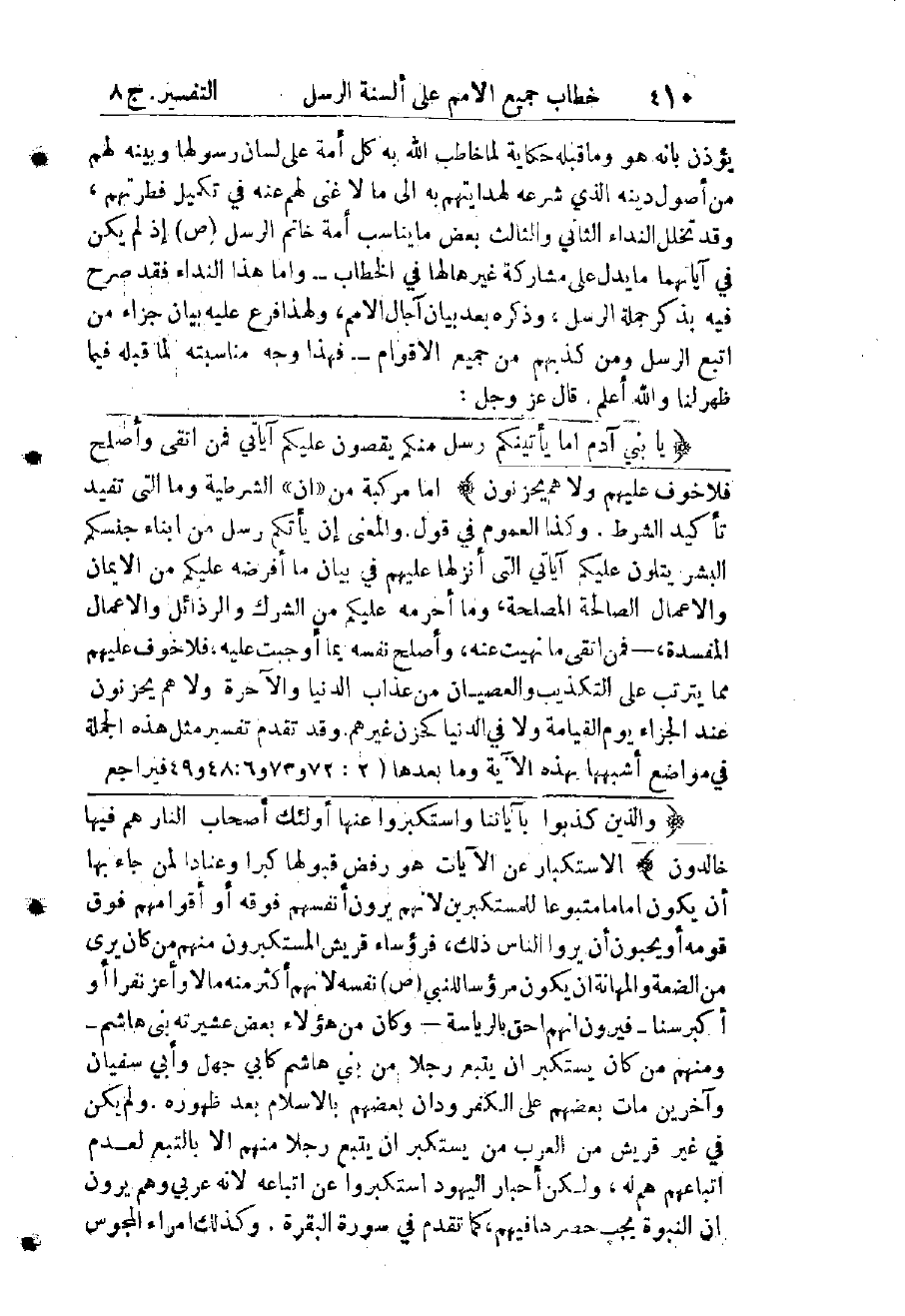 وَرَوَى أَبُو الشَّيْخِ عَنْ أَبِي بَكْرِ بْنِ عَيَّاشٍ أَنَّهُ سُئِلَ عَنْ قَوْلِهِ: (وَلَا تُفْسِدُوا فِي الْأَرْضِ بَعْدَ إِصْلَاحِهَا) (56، 85) فَقَالَ: إِنَّ اللهَ بَعَثَ مُحَمَّدًا إِلَى أَهْلِ الْأَرْضِ وَهُمْ فِي فَسَادٍ فَأَصْلَحَهُمُ اللهُ بِمُحَمَّدٍ صَلَّى اللَّهُ عَلَيْهِ وَسَلَّمَ فَمَنْ دَعَا إِلَى خِلَافِ مَا جَاءَ بِهِ مُحَمَّدٌ صَلَّى اللَّهُ عَلَيْهِ وَسَلَّمَ فَهُوَ مِنَ الْمُفْسِدِينَ فِي الْأَرْضِ اهـ. وَالْإِفْسَادُ بَعْدَ الْإِصْلَاحِ أَظْهَرُ قُبْحًا مِنَ الْإِفْسَادِ عَلَى الْإِفْسَادِ، فَإِنَّ وُجُودَ الْإِصْلَاحِ أَكْبَرُ حُجَّةً عَلَى الْمُفْسِدِ إِذَا هُوَ لَمْ يَحْفَظْهُ وَيَجْرِي عَلَى سَنَنِهِ. فَكَيْفَ إِذَا هُوَ أَفْسَدَ وَأَخْرَجَهُ عَنْ وَضْعِهِ؟ وَلِذَلِكَ خَصَّهُ بِالذِّكْرِ، وَإِلَّا فَالْإِفْسَادُ مَذْمُومٌ وَمَنْهِيٌّ عَنْهُ فِي كُلِّ حَالٍ، فَحُجَّةُ اللهِ عَلَى الْخُلُوفِ وَالْخَلَائِفِ مِنَ الْمُسْلِمِينَ الْمُفْسِدِينَ، لِمَا كَانَ مِنْ إِصْلَاحِ السَّلَفِ الصَّالِحِينَ، أَظْهَرُ مِنْ حُجَّتِهِ عَلَى الْكَافِرِينَ، الَّذِينَ هُمْ أَحْسَنُ حَالًا مِنْ سَلَفِهِمُ الْغَابِرِينَ.
