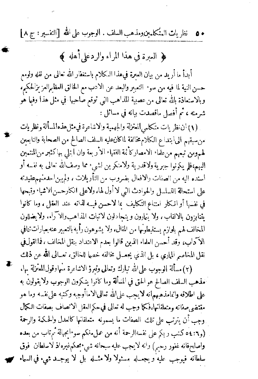 (7) يُمْكِنُ رَدُّ نَظَرِيَّاتِ الشَّيْخِ الْأَشْعَرِيِّ وَنَظَرِيَّاتِ شَيْخِهِ الْجُبَّائِيِّ مَعًا مِنْ وُجُوهٍ أُخْرَى عَلَى مَذْهَبِ السَّلَفِ الَّذِي هُوَ الْأَخْذُ بِظَوَاهِرِ النُّصُوصِ مِنْ أَنَّ الثَّوَابَ بِالْإِيمَانِ وَالْعَمَلِ، وَأَنَّ الْأَحْكَامَ الشَّرْعِيَّةَ مَبْنِيَّةٌ عَلَى الْحِكْمَةِ، وَمُعَلَّلَةٌ بِمَا يَرْجِعُ إِلَى دَرْءِ الْمَفَاسِدِ وَجَلْبِ الْمَصَالِحِ وَالْمَنَافِعِ الدُّنْيَوِيَّةِ وَالْأُخْرَوِيَّةِ، وَكَوْنِ الدُّنْيَا مَزْرَعَةَ الْآخِرَةِ، وَكَذَا عَلَى مَذْهَبِ الْمُعْتَزِلَةِ عَلَى مَا حَرَّرَهُ الشَّيْخُ الْمُقْبِلِيُّ نَقْلًا عَنْ كُتُبِهِمْ، فَنَذْكُرُ بَعْضَ مَا يَخْطُرُ مِنْ ذَلِكَ بِالْبَالِ، لِيَكُونَ نَمُوذَجًا لِمَنْ يَبْنِي عَقِيدَتَهُ عَلَى قَوَاعِدِ الْحُجَّةِ وَالْبُرْهَانِ، وَيَعْرِفُ الْحَقَّ بِنَفْسِهِ لَا بِآرَاءِ الرِّجَالِ، فَنَقُولُ: