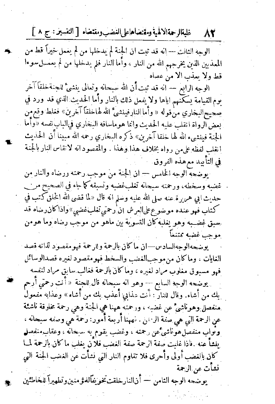 الْوَجْهُ الثَّانِي وَالْعِشْرُونَ - أَنَّهُ سُبْحَانَهُ قَدْ أَوْجَبَ الْخُلُودَ عَلَى مَعَاصِيَ مِنَ الْكَبَائِرِ وَقَيَّدَهُ بِالتَّأْبِيدِ وَلَمْ يُنَافِ ذَلِكَ انْقِطَاعَهُ وَانْتِهَاءَهُ، فَمِنْهَا قَوْلُهُ تَعَالَى: (وَمَنْ يَقْتُلْ مُؤْمِنًا مُتَعَمِّدًا فَجَزَاؤُهُ جَهَنَّمُ خَالِدًا فِيهَا وَغَضِبَ اللهُ عَلَيْهِ وَلَعَنَهُ وَأَعَدَّ لَهُ عَذَابًا عَظِيمًا) (4: 93) وَمِنْهَا قَوْلُ النَّبِيِّ صَلَّى اللَّهُ عَلَيْهِ وَسَلَّمَ: " مَنْ قَتَلَ نَفْسَهُ بِحَدِيدَةٍ فَحَدِيدَتُهُ فِي يَدِهِ يَتَوَجَّأُ بِهَا فِي نَارِ جَهَنَّمَ خَالِدًا مُخَلَّدًا فِيهَا أَبَدًا " وَهُوَ حَدِيثٌ صَحِيحٌ. وَكَذَلِكَ قَوْلُهُ فِي الْحَدِيثِ الْآخَرِ فِي قَاتِلِ نَفْسِهِ: " فَيَقُولُ اللهُ