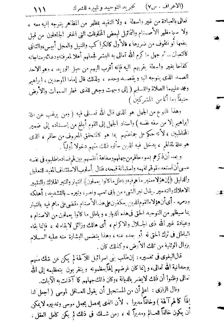 وَالنَّقْلِ - مَانِعًا لَهُ مِنْ هَذَا الطَّلَبِ، وَلَمْ يَكُنْ دِينُهُ وَعِلْمُهُ بِاللهِ - تَعَالَى - وَهُمَا فِي الذُّرْوَةِ الْعُلْيَا أَيْضًا - مَانِعَيْنِ لَهُ مِنْهُ، وَلَكِنَّ اللهَ - تَعَالَى - قَالَ لَهُ: لَنْ تَرَانِي وَلِكَيْ يُخَفِّفَ عَلَيْهِ أَلَمَ الرَّدِّ وَهُوَ كَلِيمُهُ الَّذِي قَالَ لَهُ فِي أَوَّلِ الْعَهْدِ بِالْوَحْيِ إِلَيْهِ: وَاصْطَنَعَتْكَ لِنَفْسِي (20: 41) أَرَاهُ بِعَيْنَيْهِ وَمَجْمُوعِ إِدْرَاكِهِ مِنْ تَجَلِّيهِ لِلْجَبَلِ بِمَا لَا يَعْلَمُهُ سِوَاهُ أَنَّ الْمَانِعَ مِنْ جِهَتِهِ هُوَ لَا مِنَ الْجُودِ الرَّبَّانِيِّ، فَنَزَّهَ اللهَ وَسَبَّحَهُ وَتَابَ إِلَيْهِ مِنْ هَذَا الطَّلَبِ، فَبَشَّرَهُ اللهُ - تَعَالَى - بِأَنَّهُ اصْطَفَاهُ عَلَى النَّاسِ بِرِسَالَتِهِ وَبِكَلَامِهِ - أَيْ: بِدُونِ رُؤْيَتِهِ -، وَأَمَرَهُ بِأَنْ يَأْخُذَ مَا أَعْطَاهُ، وَيَكُونَ مِنَ الشَّاكِرِينَ لَهُ.