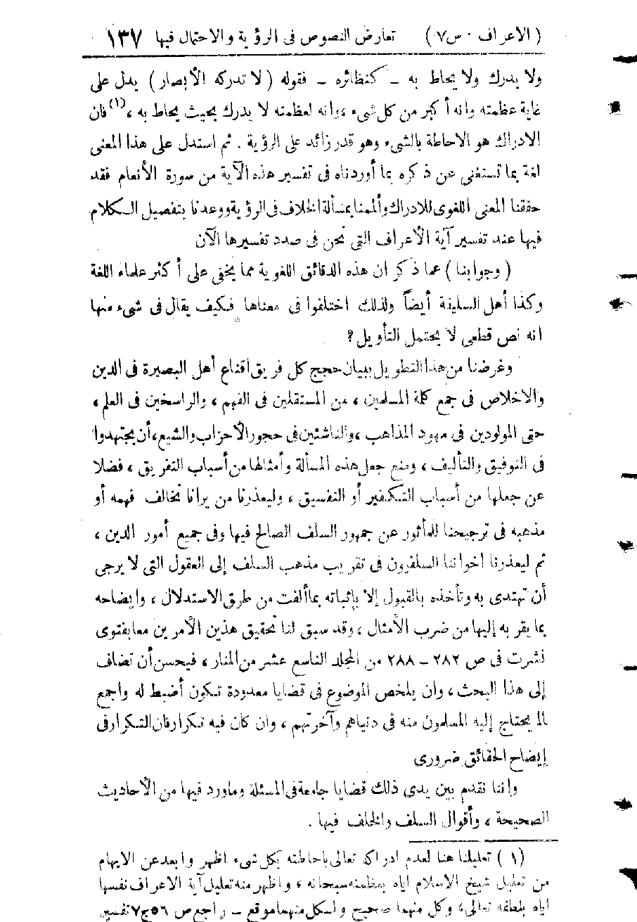 قَدْ عُلِمَ مِمَّا تَقَدَّمَ أَنَّهُ لَيْسَ فِي الرُّؤْيَةِ الْبَصَرِيَّةِ نَصٌّ أُصُولِيٌّ وَلَا لُغَوِيٌّ مُتَوَاتِرٌ قَطْعِيُّ الرِّوَايَةِ وَالدَّلَالَةِ يَجْعَلُهَا مِنَ الْعَقَائِدِ الْمُجْمَعِ عَلَيْهَا الْمَعْلُومَةِ مِنَ الدِّينِ بِالضَّرُورَةِ، وَلَيْسَتْ مِمَّا كَانَ يُدْعَى إِلَيْهِ فِي تَبْلِيغِ الدِّينِ مِنَ التَّوْحِيدِ وَالرِّسَالَةِ بِحَيْثُ يَكُونُ مَنْ يَجْهَلُهَا أَوْ يُنْكِرُهَا كَافِرًا، وَإِنَّمَا هِيَ مِنْ غَرِيبِ الْعِلْمِ إِلَّا عَلَى الَّذِي يَسْتَنْبِطُهُ مِنَ الْقُرْآنِ كِبَارُ الْعَارِفِينَ، وَرُبَّمَا كَانَ فِتْنَةً لِمَنْ دُونَهُمْ - وَكَذَلِكَ كَانَ - حَتَّى إِنَّ كِبَارَ النُّظَّارِ وَعُلَمَاءَ الْبَيَانِ قَدِ اخْتَلَفُوا فِي كُلٍّ مِنَ الْآيَاتِ الثَّلَاثِ الْوَارِدَةِ فِيهَا: فِي سُورَةِ الْأَنْعَامِ وَالْأَعْرَافِ وَالْقِيَامَةِ. فَجَعَلَهَا بَعْضُهُمْ مُثْبِتَةً وَبَعْضُهُمْ نَافِيَةً، وَالْقَاعِدَةُ فِي دِينِ الرَّحْمَةِ وَالشَّرِيعَةِ السَّمْحَةِ أَنَّ الْحُجَّةَ لَا تَقُومُ عَلَى جَمِيعِ الْمُكَلَّفِينَ إِلَّا فِيمَا كَانَ قَطْعِيَّ الدَّلَالَةِ لُغَةً، وَأَنَّهُمْ يُعْذَرُونَ بِاخْتِلَافِ الْأَفْهَامِ فِي غَيْرِهِ، كَمَا عُلِمَ مِنْ وَاقِعَةِ تَحْرِيمِ الْخَمْرِ وَالْمَيْسِرِ، فَإِنَّ آيَةَ الْبَقَرَةِ تَدُلُّ عَلَى التَّحْرِيمِ بِمُقْتَضَى الْقَاعِدَةِ الْمَعْرُوفَةِ عِنْدَ الْفُقَهَاءِ، وَهِيَ تَحْرِيمُ مَا تَغْلِبُ الْمَفْسَدَةُ فِيهِ عَلَى الْمَصْلَحَةِ، وَيُرَجَّحُ الضَّرَرُ فِيهِ عَلَى النَّفْعِ، وَقَدْ نَطَقَتِ الْآيَةُ بِهَذَا التَّرْجِيحِ فِي الْخَمْرِ وَالْمَيْسِرِ وَإِثْمُهُمَا أَكْبَرُ مِنْ نَفْعِهِمَا (2: 219) وَهُوَ مَا فَهِمَهُ بَعْضُ خَوَاصِّ الصَّحَابَةِ فَتَرَكُوهُمَا، وَلَمْ يُكَلِّفْ جَمِيعَ الْمُسْلِمِينَ تَرْكَهُمَا إِلَّا بَعْدَ نُزُولِ آيَةِ الْمَائِدَةِ الَّتِي هِيَ نَصٌّ قَطْعِيٌّ لَا يَحْتَمِلُ التَّأْوِيلَ؛ إِذْ نَطَقَتْ بِأَنَّهُمَا رِجْسٌ مِنْ عَمَلِ الشَّيْطَانِ، وَصَرَّحَتْ بِالْأَمْرِ بِاجْتِنَابِهِ، وَهُوَ أَبْلَغُ مِنَ الْأَمْرِ بِالتَّرْكِ.