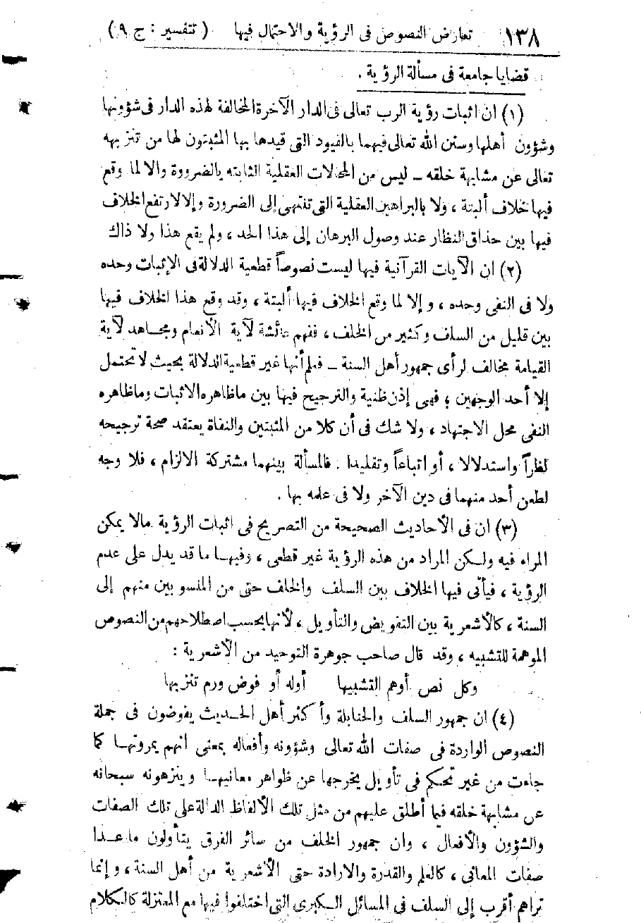 ذَلِكَ فِي آيَةٍ صَرِيحَةٍ لَا تَحْتَمِلُ التَّأْوِيلَ، نَاطِقَةٌ بِأَنَّهُ يُرَى بِالْأَبْصَارِ عِيَانًا بِلَا كَيْفٍ وَلَا إِحَاطَةٍ وَلَا تَمْثِيلٍ، وَلَقَالَ النَّبِيُّ - صَلَّى اللَّهُ عَلَيْهِ وَسَلَّمَ - حِينَ عَرَّفَ الْإِيمَانَ فِي حَدِيثِ جِبْرِيلَ بَعْدَ قَوْلِهِ: " أَنْ تُؤْمِنَ بِاللهِ وَمَلَائِكَتِهِ وَكُتُبِهِ وَرُسُلِهِ وَالْيَوْمِ الْآخِرِ ": وَأَنَّ الْمُؤْمِنِينَ يَرَوْنَ رَبَّهُمْ فِي الْآخِرَةِ بِأَبْصَارِهِمْ عِيَانًا بِلَا كَيْفٍ وَلَا تَشْبِيهٍ، وَلَأَمَرَ بِتَلْقِينِ هَذَا لِكُلِّ مَنْ يَدْخُلُ فِي الْإِسْلَامِ، وَلَتَوَاتَرَ عَنْهُ وَعَنْ أَصْحَابِهِ الْجَرْيُ عَلَى ذَلِكَ حَتَّى يَكُونَ مَعْلُومًا مِنَ الدِّينِ بِالضَّرُورَةِ، وَإِذًا لَمَا وَقَعَ فِيهِ خِلَافٌ، وَلَمَا اسْتَنْكَرَتْ عَائِشَةُ سُؤَالَ مَسْرُوقٍ إِيَّاهَا عَنْ رُؤْيَةِ النَّبِيِّ - صَلَّى اللَّهُ عَلَيْهِ وَسَلَّمَ - لِرَبِّهِ حَتَّى قَفَّ شَعْرُهَا مِنِ اسْتِعْظَامِ ذَلِكَ، وَلَوْ كَانَتْ تَعْتَقِدُ أَنَّ الرُّؤْيَةَ تَكُونُ فِي الْآخِرَةِ لِجَمِيعِ الْمُؤْمِنِينَ لَمَا اسْتَنْكَرَتْ وَاسْتَكْبَرَتْ حُصُولَهَا لِلنَّبِيِّ - صَلَّى اللَّهُ عَلَيْهِ وَسَلَّمَ - فِي الدُّنْيَا امْتِيَازًا لَهُ؛ لِأَنَّ رُوحَهُ فِيهَا أَقْوَى مِنْ أَرْوَاحِ سَائِرِ الْمُؤْمِنِينَ فِي الْآخِرَةِ فَيَطِيقُ مَا لَا يُطِيقُهُ غَيْرُهُ حَتَّى مُوسَى - صَلَّى اللَّهُ عَلَيْهِ وَسَلَّمَ - وَلَقَاسَتْ هَذَا الِامْتِيَازَ عَلَى النَّاسِ بِامْتِيَازِهِ - عَلَيْهِ صَلَوَاتُ اللهِ - عَلَيْهِمْ بِالْوَحْيِ وَرُؤْيَةِ الْمَلَائِكَةِ وَغَيْرِ الْمَلَائِكَةِ مِنْ عَالَمِ الْغَيْبِ؛ عَلَى أَنَّهُ - صَلَّى اللَّهُ عَلَيْهِ وَسَلَّمَ - كَانَ لَيْلَةَ الْمِعْرَاجِ فِي ذَلِكَ الْعَالَمِ لَا فِي عَالَمِ الْأَرْضِ.