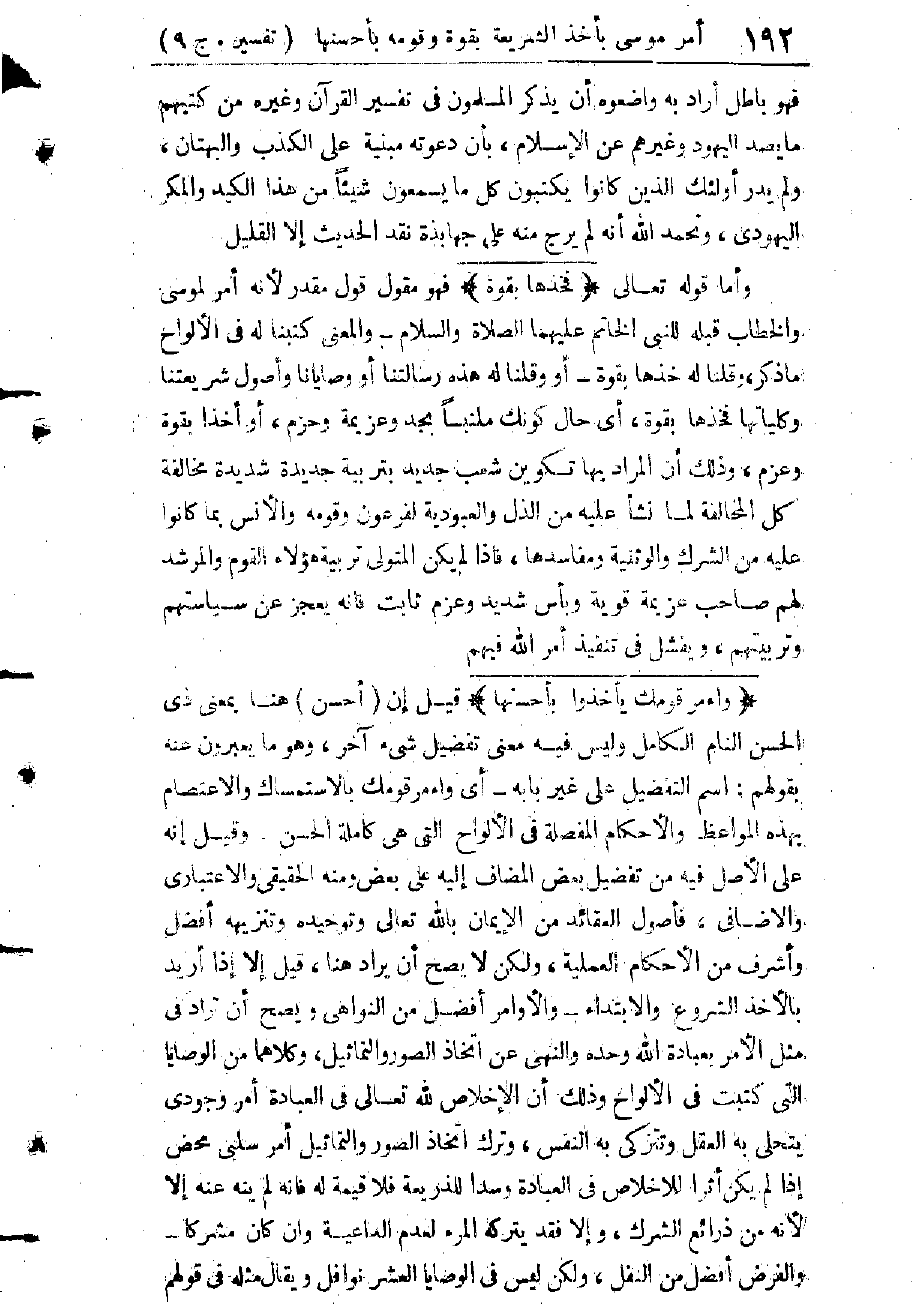 بِظَوَاهِرِ نُصُوصِ الْقُرْآنِ، فِي كُلِّ صِفَةٍ مِنْ صِفَاتِ الرَّحْمَنِ، وَلَمَا قَالَ مِثْلُ الزَّمَخْشَرِيِّ مِنْ جَهَابِذَةِ الْبَيَانِ، فِي تَفْسِيرِ قَوْلِهِ - تَعَالَى - عَذَابِي أُصِيبُ بِهِ مَنْ أَشَاءُ أَيْ: مَنْ وَجَبَ عَلَيَّ فِي الْحِكْمَةِ تَعْذِيبُهُ، وَلَمْ يَكُنْ فِي الْعَفْوِ عَنْهُ مَسَاغٌ؛ لِأَنَّهُ مَفْسَدَةٌ انْتَهَى. فَقَدْ فَسَّرَ مَنْ يَشَاءُ تَعَالَى تَعْذِيبَهُ بِمَنْ وَجَبَ عَلَيْهِ تَعْذِيبُهُ، وَجَمَاعَتُهُ يَقُولُونَ إِنَّ هَذَا وُجُوبٌ عَقْلِيٌّ لَا يَدْخُلُ الْإِمْكَانُ سِوَاهُ وَلَا تَتَعَلَّقُ الْقُدْرَةُ بِخِلَافِهِ، وَهَذَا الْمَعْنَى يُنَافِي الْمَشِيئَةَ مُنَافَاةً قَطْعِيَّةً فَكَيْفَ تُفَسَّرُ بِهِ؟ ! يَا لَيْتَ الزَّمَخْشَرِيَّ لَمْ يَنْتَحِلْ مَذْهَبًا، وَلَمْ يَنْظُرْ فِي خِلَافِ الْمَذَاهِبِ، وَإِذًا لَكَانَ كَشَّافُهُ حُجَّةً عَلَى أَصْحَابِهَا وَمَرْجِعًا لَهُمْ فِي تَحْرِيرِ مَعَانِي نُصُوصِ الْكِتَابِ وَالسُّنَّةِ وَآثَارِ السَّلَفِ؛ إِذْ كَانَ مِنْ أَدَقِّ عُلَمَاءِ هَذِهِ اللُّغَةِ فَهْمًا وَأَحْسَنِهِمْ بَيَانًا وَلَمَا فَهِمَ، وَمَسْأَلَةُ الْوُجُوبِ عَلَى اللهِ - تَعَالَى - نَظَرِيَّةٌ فِكْرِيَّةٌ لَا لُغَوِيَّةٌ، وَالْجَمْعُ بَيْنَ الْحِكْمَةِ وَالرَّحْمَةِ لَا يَقْتَضِي أَنْ يَجِبَ عَلَى اللهِ - تَعَالَى - شَيْءٌ لِذَاتِهِ، وَلَيْسَ فِي النُّصُوصِ مَا يَدُلُّ عَلَى هَذَا الْوُجُوبِ إِلَّا أَنْ يُوجِبَهُ تَعَالَى بِمَشِيئَتِهِ، بِمَعْنَى كِتَابَتِهِ وَجَعْلِهِ أَمْرًا مَقْضِيًّا، وَلَيْسَ فِي إِيجَابِهِ عَلَى نَفْسِهِ بِمَشِيئَتِهِ مَا فِي إِيجَابِ عُقُولِ خَلْقِهِ عَلَيْهِ مِنْ مَعْنَى اسْتِعْلَاءِ غَيْرِهِ عَلَيْهِ تَعَالَى - أَوْ مِنْ إِيهَامِ كَوْنِهِ - عَزَّ وَجَلَّ - مَحْكُومًا