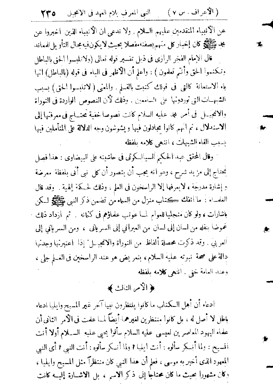 (الثَّالِثُ) قَالَ النَّبِيُّ - صَلَّى اللَّهُ عَلَيْهِ وَسَلَّمَ -: " مَثَلِي وَمَثَلُ الْأَنْبِيَاءِ كَمَثَلِ قَصْرٍ أُحْسِنَ بُنْيَانُهُ وَتُرِكَ مِنْهُ مَوْضِعُ لَبِنَةٍ فَطَافَ بِهَا النُّظَّارُ يَتَعَجَّبُونَ مِنْ حُسْنِ بُنْيَانِهِ إِلَّا مَوْضِعَ تِلْكَ اللَّبِنَةِ، خُتِمَ بِي الْبُنْيَانُ وَخُتِمَ بِي الرُّسُلُ " وَلَمَّا ثَبَتَتْ نُبُوَّتُهُ بِالْأَدِلَّةِ الْأُخْرَى، كَمَا ذَكَرْتُ نُبَذًا مِنْهَا فِي الْمَسَالِكِ السَّابِقَةِ، فَلَا بَأْسَ بِأَنْ أَسْتَدِلَّ فِي هَذِهِ الْبِشَارَةِ بِقَوْلِهِ أَيْضًا.