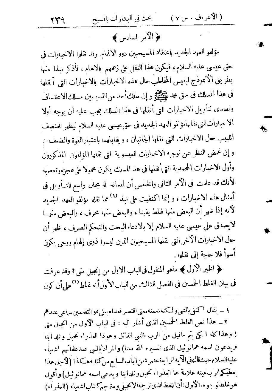 وَأَقُولُ: إِنَّ التَّفَاوُتَ بَيْنَ اللَّفْظَيْنِ يَسِيرٌ جِدًّا، وَإِنَّ الْحُرُوفَ الْيُونَانِيَّةَ كَانَتْ مُتَشَابِهَةً، فَتَبَدُّلُ بيركلوطوس بباراكلي طوس فِي بَعْضِ النُّسَخِ مِنَ الْكَاتِبِ قَرِيبُ الْقِيَاسِ، ثُمَّ رَجَّحَ أَهْلُ التَّثْلِيثِ الْمُنْكِرِينَ هَذِهِ النُّسْخَةَ عَلَى النُّسَخِ الْأُخَرِ، وَمَنْ تَأْمَّلَ فِي الْبَابِ الثَّانِي مِنْ هَذَا الْكِتَابِ. وَالْأَمْرَ السَّابِعَ مِنْ هَذَا الْمَسْلَكِ السَّادِسِ بِنَظَرِ الْإِنْصَافِ اعْتَقَدَ يَقِينًا بِأَنَّ مِثْلَ هَذَا الْأَمْرِ مَنْ أَهْلِ الدِّيَانَةِ مِنْ أَهْلِ التَّثْلِيثِ لَيْسَ بِبَعِيدٍ بَلْ لَا يَبْعُدُ أَنْ يَكُونَ مِنَ الْمُحَسِّنَاتِ.