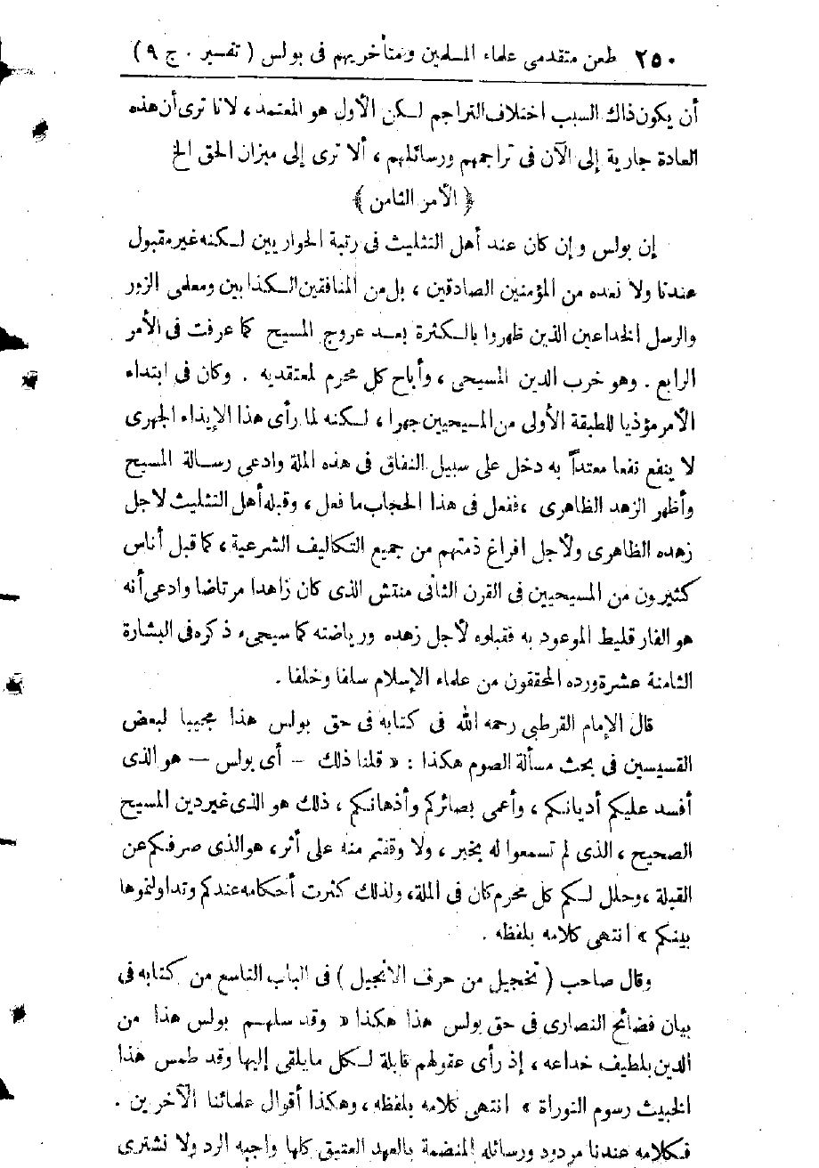 اللَّتَيْنِ وُجِدَتَا مِنْ هَذَا الْإِنْجِيلِ فِي أَوَّلِ الْقَرْنِ الثَّامِنَ عَشَرَ، وَهِيَ النُّسْخَةُ الْأَسْبَانِيَّةُ وَقَدْ فُقِدَتْ، إِذْ كَانَ الْمُتَعَصِّبُونَ مِنَ النَّصَارَى يُتْلِفُونَ كُلَّ مَا عَثَرُوا عَلَيْهِ مِنْ هَذَا الْإِنْجِيلِ وَغَيْرِهِ مِنَ الْأَنَاجِيلِ الَّتِي تَعُدُّهَا الْكَنِيسَةُ غَيْرَ قَانُونِيَّةٍ، وَأَمَّا النُّسْخَةُ الْأُخْرَى فَهِيَ بِاللُّغَةِ الْإِيطَالِيَّةِ الْقَدِيمَةِ وَكَانَتْ فِي خِزَانَةِ كُتُبِ (الْفَاتِيكَانْ) فَسَرَقَهَا مِنْهَا رَاهِبٌ اسْمُهُ (مرينو) فِي أَوَاخِرِ الْقَرْنِ السَّادِسَ عَشَرَ، وَيَظُنُّ أَنَّهَا هِيَ النُّسْخَةُ الْمَوْجُودَةُ الْآنَ فِي خِزَانَةِ كُتُبِ بَلَاطِ (فِيِينَّا) وَقَدْ تُرْجِمَتْ هَذِهِ النُّسْخَةُ بِالْإِنْكِلِيزِيَّةِ فِي هَذَا الْعَصْرِ فَسَعَيْنَا إِلَى تَرْجَمَتِهَا بِالْعَرَبِيَّةِ سَنَةَ 1325 وَطَبَعْنَاهَا طَبْعًا دَقِيقًا فِي مَطْبَعَةِ الْمَنَارِ، وَإِنَّنَا نَنْقُلُ عَنْهَا هُنَا نَصَّ بَعْضِ بِشَارَاتِهِ بِنَبِيِّنَا - صَلَّى اللَّهُ عَلَيْهِ وَسَلَّمَ - غَيْرَ الْبِشَارَةِ الَّتِي نَقَلَهَا الشَّيْخُ رَحْمَةُ اللهِ إِذْ هِيَ مُتَعَدِّدَةٌ.
