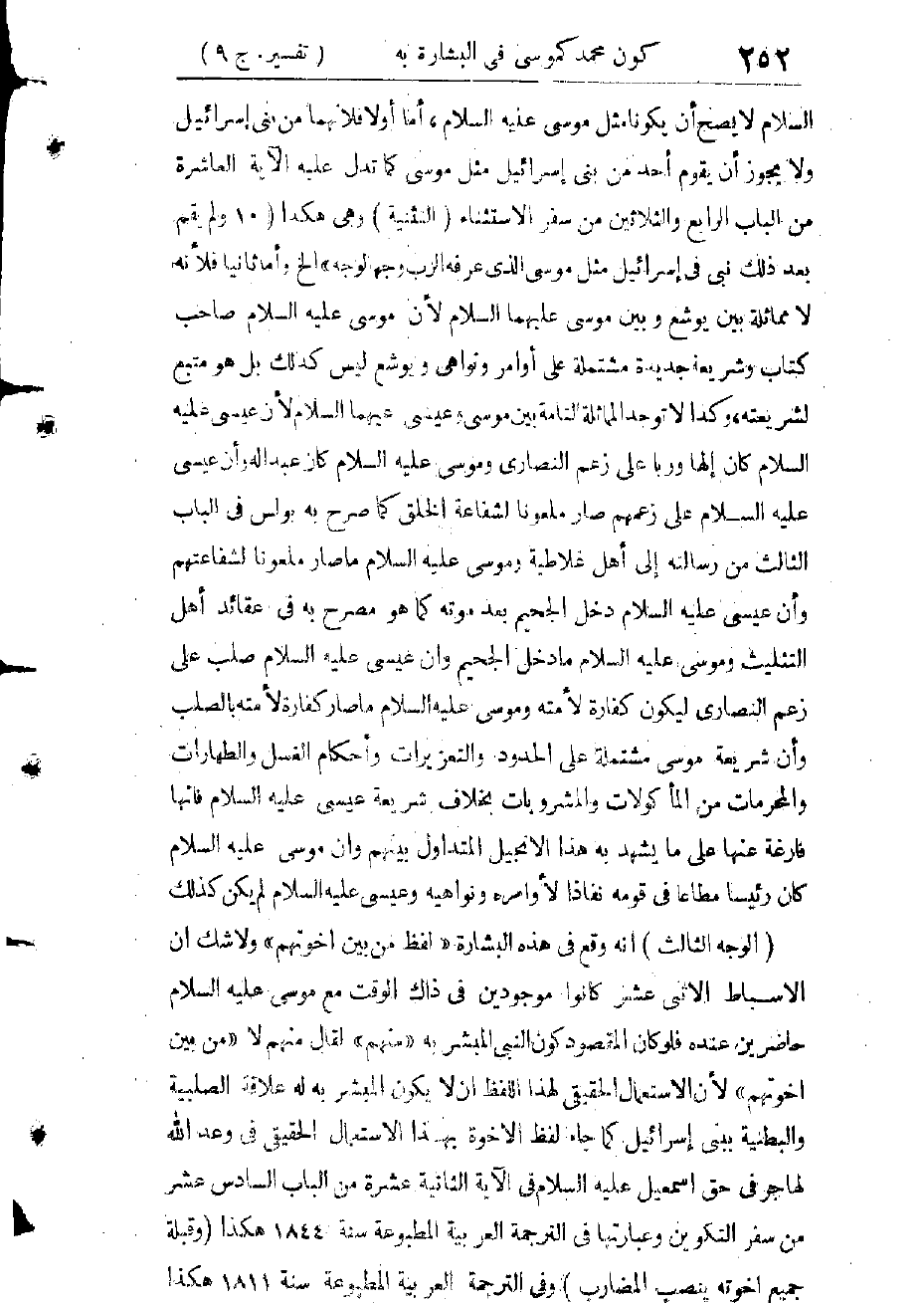 وَقَدْ فَنَّدْنَا هَذِهِ الشُّبْهَةَ فِي مُقَدِّمَتِنَا لِطَبْعَةِ هَذَا الْإِنْجِيلِ الْعَرَبِيَّةِ بِمَا بَيَّنَاهُ مِنِ اسْتِحَالَةِ صُدُورِ هَذِهِ الْحَوَاشِي عَنْ مُسْلِمٍ، فَإِنَّهَا عَلَى فَسَادِ لُغَتِهَا وَعُجْمَتِهَا مُخَالَفَةٌ لِمَا يَعْرِفُهُ كُلُّ مُسْلِمٍ عَرَبِيًّا كَانَ أَوْ عَجَمِيًّا ; لِأَنَّهُ مِنْ أَذْكَارِ الدِّينِ كَكَلِمَةِ سُبْحَانَ اللهِ فَهِيَ تُذْكَرُ فِي هَذِهِ الْحَوَاشِي بِتَقْدِيمِ الْمُضَافِ