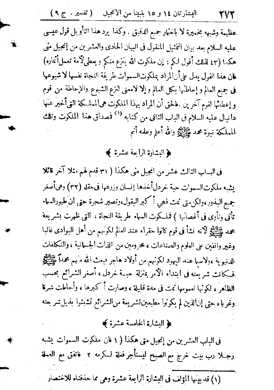 الْكَثِيرَةِ الصَّرِيحَةِ فِيهَا، وَإِجْمَاعِ السَّلَفِ وَالْخَلْفِ بِالْعِلْمِ وَالْعَمَلِ عَلَيْهَا، وَعَدَمِ شُذُوذِ أَصْحَابِ الْمَذَاهِبِ وَالْفِرَقِ حَتَّى الْمُبْتَدَعَةِ عَنْهَا، فَقَدْ كَثُرَ الْخِلَافُ وَالتَّفَرُّقُ فِي الدِّينِ، وَتَعَدَّدَتِ الْأَحْزَابُ وَالشِّيَعُ فِي الْمُسْلِمِينَ، عَلَى مَا وَرَدَ فِي النَّهْيِ عَنْ ذَلِكَ وَالْوَعِيدِ عَلَيْهِ فِي الْآيَاتِ الصَّرِيحَةِ، وَالْأَحَادِيثِ الصَّحِيحَةِ، وَارْتَدَّ بَعْضُ الْفِرَقِ عَنِ الدِّينِ، بِضُرُوبٍ مِنْ فَاسِدِ التَّأْوِيلِ، وَسَخَافَاتٍ مِنْ أَبَاطِيلِ التَّحْرِيفِ، كَمَا فَعَلَ زَنَادِقَةُ الْبَاطِنِيَّةِ، وَغَيْرُهُمْ، قَبْلَ أَنْ يَقْوُوا وَيُصَرِّحُوا بِكُفْرِهِمْ، وَلَمْ تَقُمْ فِرْقَةٌ تَنْتَمِي إِلَى الْإِسْلَامِ بِتَرْجَمَةِ الْقُرْآنِ وَلَا ضَلَّتْ طَائِفَةٌ بِتَرْجَمَةِ أَذْكَارِ الصَّلَاةِ وَالْآذَانِ ; لِأَجْلِ الِاسْتِغْنَاءِ بِهَا فِي التَّعَبُّدِ لِلَّهِ، عَنِ اللَّفْظِ الْمُنَزَّلِ مِنْ عِنْدِ اللهِ، وَإِنَّمَا قُصَارَى مَا وَقَعَ مِنَ الْخِلَافِ فِيمَا حَوْلَ ذَلِكَ مِنْ فُرُوعِ الْمَسْأَلَةِ، وَمِنْ تَصْوِيرِ الْفُقَهَاءِ لِلْوَقَائِعِ النَّادِرَةِ، أَنَّهُ إِذَا أَسْلَمَ أَعْجَمِيٌّ مَثَلًا، وَأَرَدْنَا تَعْلِيمَهُ الصَّلَاةَ فَلَمْ يَسْتَطِعْ لِسَانُهُ أَنْ يَنْطِقَ بِأَلْفَاظِ الْفَاتِحَةِ فَهَلْ يُصَلِّي بِمَعَانِيهَا مِنْ لُغَتِهِ، أَمْ يَسْتَبْدِلَ بِهَا بَعْضُ الْأَذْكَارِ الْعَرَبِيَّةِ الْمَأْثُورَةِ مُؤَقَّتًا رَيْثَمَا يَتَعَلَّمُ الْقُرْآنَ كَمَا وَرَدَ فِي بَعْضِ الْأَحَادِيثِ، أَمْ يُصَلِّيَ بِتَرْجَمَةِ الْفَاتِحَةِ بِلُغَتِهِ؟ نُقِلَ الْقَوْلُ الْأَخِيرِ عَنْ أَبِي
