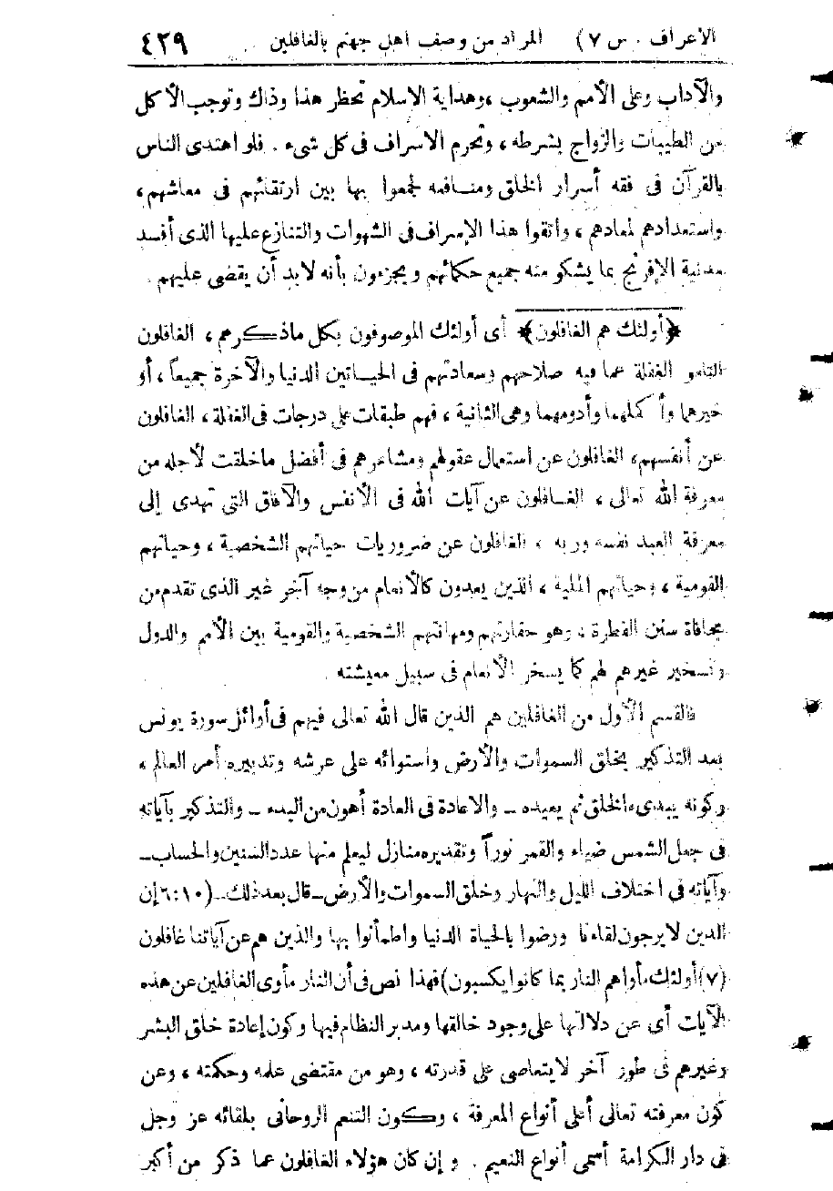 إِنْ أَنَا إِلَّا نَذِيرٌ وَبَشِيرٌ لِقَوْمٍ يُؤْمِنُونَ هَذَا بَيَانٌ مُسْتَأْنَفٌ لِتَعْلِيلِ مَا تَقَدَّمَ مِنْ نَفْيِ امْتِيَازِهِ - صَلَّى اللَّهُ عَلَيْهِ وَسَلَّمَ - عَلَى الْبَشَرِ بِمِلْكِ النَّفْعِ وَالضُّرِّ مِنْ غَيْرِ طُرُقِ الْأَسْبَابِ وَسُنَنِ اللهِ فِي الْخَلْقِ - وَنَفْيِ امْتِيَازِهِ عَلَيْهِمْ بِعِلْمِ الْغَيْبِ، عَلَّلَهَا بِبَيَانِ حَصْرِ امْتِيَازِهِ عَلَيْهِمْ بِالتَّبْلِيغِ عَنِ اللهِ عَزَّ وَجَلَّ. وَالتَّبْلِيغُ قِسْمَانِ: قِسْمٌ مُقْتَرِنٌ بِالتَّخْوِيفِ مِنَ الْعِقَابِ عَلَى الْكُفْرِ وَالْمَعَاصِي وَهُوَ الْإِنْذَارُ، وَقَسْمٌ مُقْتَرِنٌ بِالتَّرْغِيبِ فِي الثَّوَابِ عَلَى الْإِيمَانِ وَالطَّاعَةِ، وَهُوَ الْبِشَارَةُ أَوِ التَّبْشِيرُ، وَكُلٌّ مِنْهُمَا يُوَجَّهُ إِلَى جَمِيعِ أُمَّةِ الدَّعْوَةِ عَلَى الْإِطْلَاقِ وَالْآيَاتُ فِيهِ كَثِيرَةٌ، وَيُوَجَّهُ أَيْضًا إِلَى مَنْ يُؤْمِنَ، وَإِلَى مَنْ يُصِرُّ عَلَى كُفْرِهِ وَإِجْرَامِهِ مُطْلَقًا، وَإِذَا ذُكِرَ الْفَرِيقَانِ جَمِيعًا فِي سِيَاقٍ وَاحِدٍ يُخَصُّ الْكَافِرُونَ بِالْإِنْذَارِ وَالْمُؤْمِنُونَ الصَّالِحُونَ بِالتَّبْشِيرِ، وَقَدْ ذُكِرَ فِي أَوَّلِ سُورَةِ الْكَهْفِ الْإِنْذَارُ الْمُطْلَقُ بِالْقُرْآنِ، ثُمَّ تَبْشِيرُ الْمُؤْمِنِينَ الَّذِينَ يَعْمَلُونَ الصَّالِحَاتِ، وَإِنْذَارُ مُتَّخِذِي الْوَلَدِ لِلَّهِ تَعَالَى مِنَ الْكَافِرِينَ. وَمِنَ الْمُقَابَلَةِ بَيْنَ الْفَرِيقَيْنِ قَوْلُهُ تَعَالَى فِي آخِرَ سُورَةِ مَرْيَمَ: لِتُبَشِّرَ بِهِ الْمُتَّقِينَ وَتُنْذِرَ بِهِ قَوْمًا لُدًّا (19: 97) وَفِي مَعْنَاهُمَا آيَاتٌ أُخْرَى فِي الْمُقَابَلَةِ كَمَا تَرَى فِي أَوَائِلِ سُورَتَيِ الْبَقَرَةِ وَالْإِسْرَاءِ، وَلَكِنْ بِدُونُ ذِكْرِ لَفْظِ الْإِنْذَارِ. وَالتَّبْشِيرُ لَا يُوَجَّهُ إِلَى الْكَافِرِينَ وَالْمُجْرِمِينَ بِلَقَبِهِمْ إِلَّا بِأُسْلُوبِ التَّهَكُّمِ، كَقَوْلِهِ تَعَالَى: