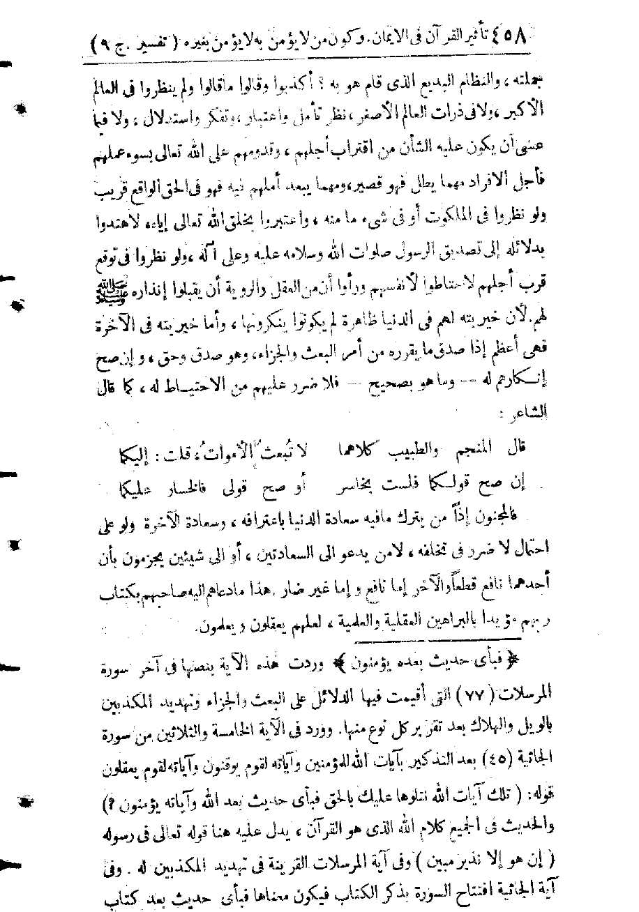 فَسَدَتِ الْعَقَائِدُ وَالْأَخْلَاقُ وَتُرِكَتِ الْعِبَادَاتُ، وَأُبِيحَتِ الْأَعْرَاضُ وَاسْتُبِيحَتِ الْمُحَرَّمَاتُ وَعُبِدَ الشَّيْطَانُ فِي مَعْصِيَةِ الرَّحْمَنِ، وَتُوجَدُ جَمْعِيَّاتٌ مِنَ الرِّجَالِ وَمِنَ النِّسَاءِ يُزَيِّنُونَ لِلنَّاسِ كُلَّ هَذِهِ الْفَضَائِحِ وَالْقَبَائِحِ بِاسْمِ التَّجْدِيدِ وَالتَّمَدُّنِ، وَلَهُمْ جَرَائِدُ تَنْشُرُ دِعَايَةَ الْإِلْحَادِ وَالزَّنْدَقَةِ، وَالْإِبَاحَةِ الْمُطْلَقَةِ، إِلَّا مِنْ بَعْضِ قُيُودِ قَانُونِ الْعُقُوبَاتِ فِي الظَّاهِرِ دُونَ الْبَاطِنِ. وَإِذَا أَنْذَرَهُمْ مُنْذِرٌ، وَحَذَّرَهُمْ مِنْ طَاعَةِ الشَّيْطَانِ مُحَذِّرٌ، قَالُوا: وَمَا الشَّيْطَانُ؟ وَمَا الدَّلِيلُ عَلَى وُجُودِ الشَّيْطَانِ؟ فَإِنْ قُلْتَ لَهُمْ: إِنَّ أَطِبَّاءَ الْأَرْوَاحِ وَأَسَاتِذَةَ أَمْرَاضِ الِاجْتِمَاعِ، قَدْ حَذَّرُونَا بِأَمْرِ اللهِ خَالِقِ مَا يُرَى وَمَا لَا يُرَى مِنْ نَزْغِ الشَّيْطَانِ وَتَزْيِينِهِ لِلْفُسُوقِ وَالْعِصْيَانِ، كَمَا يُحَذِّرُنَا أَطِبَّاءُ الْأَجْسَادِ مِنْ " مَيُكْرُوبَاتِ " الْأَمْرَاضِ، فَهَلْ مِنْ مُقْتَضَى الْعَقْلِ أَنْ نَرُدَّ كَلَامَ هَؤُلَاءِ الْأَطِبَّاءِ بِحُجَّةِ أَنَّنَا لَمْ نَرَ تِلْكَ الْمَيُكْرُوبَاتِ الْمَرَضِيَّةَ، وَأَلَّا نَقْبَلَ كَلَامَهُمْ، وَلَا نَسْتَعْمِلَ أَدْوِيَتَهُمْ إِلَّا بَعْدَ رُؤْيَةِ مَا رَأَوْا، وَاخْتِبَارِ مَا اخْتَبَرُوا؟ أَلَمْ يَقُمِ الدَّلِيلُ عَلَى صِدْقِ الرُّسُلِ عَلَيْهِمُ الصَّلَاةُ وَالسَّلَامُ فِي التَّبْلِيغِ عَنْ وَحْيِ اللهِ عَزَّ وَجَلَّ؟ بَلَى وَقَدْ ثَبَتَ بِالتَّجْرِبَةِ وَالِاخْتِبَارِ أَنَّ مَنِ اتَّبَعُوهُمْ صَحَّتْ عَقَائِدُهُمْ وَاسْتَقَامَتْ أَخْلَاقُهُمْ، وَصَلُحَتْ أَعْمَالُهُمْ، وَحُفِظَتْ صِحَّتُهُمْ وَأَعْرَاضُهُمْ وَأَمْوَالُهُمْ، فَتَجْرِبَةُ مُعَالَجَتِهِمْ لِأَمْرَاضِ الْأَنْفُسِ وَالْأَرْوَاحِ، أَثْبَتُ مِنْ تَجْرِبَةِ مُعَالَجَةِ الْأَطِبَّاءِ لِأَمْرَاضِ الْأَجْسَادِ، وَقَدْ ثَبَتَ بِالْمُشَاهَدَةِ وَالِاخْتِبَارِ أَيْضًا أَنَّ هَؤُلَاءِ الْمَادِّيِّينَ الْمُنْكِرِينَ لِوُجُودِ الشَّيَاطِينِ هُمْ أَشَدُّ فَسَادًا وَإِفْسَادًا، وَمِنْهُمْ: سِكِّيرُونَ مُقَامِرُونَ، زُنَاةٌ لُوطِيُّونَ، كَذَّابُونَ مُنَافِقُونَ، مُرْتَشُونَ سَرَّاقُونَ وَكَذَلِكَ جَعَلْنَا لِكُلِّ نَبِيٍّ عَدُوًّا شَيَاطِينَ الْإِنْسِ وَالْجِنِّ يُوحِي بَعْضُهُمْ إِلَى بَعْضٍ زُخْرُفَ الْقَوْلِ غُرُورًا وَلَوْ شَاءَ رَبُّكَ مَا فَعَلُوهُ فَذَرْهُمْ وَمَا يَفْتَرُونَ وَلِتَصْغَى إِلَيْهِ أَفْئِدَةُ الَّذِينَ لَا يُؤْمِنُونَ بِالْآخِرَةِ وَلِيَرْضَوْهُ وَلِيَقْتَرِفُوا مَا هُمْ مُقْتَرِفُونَ (6: 112، 113) .