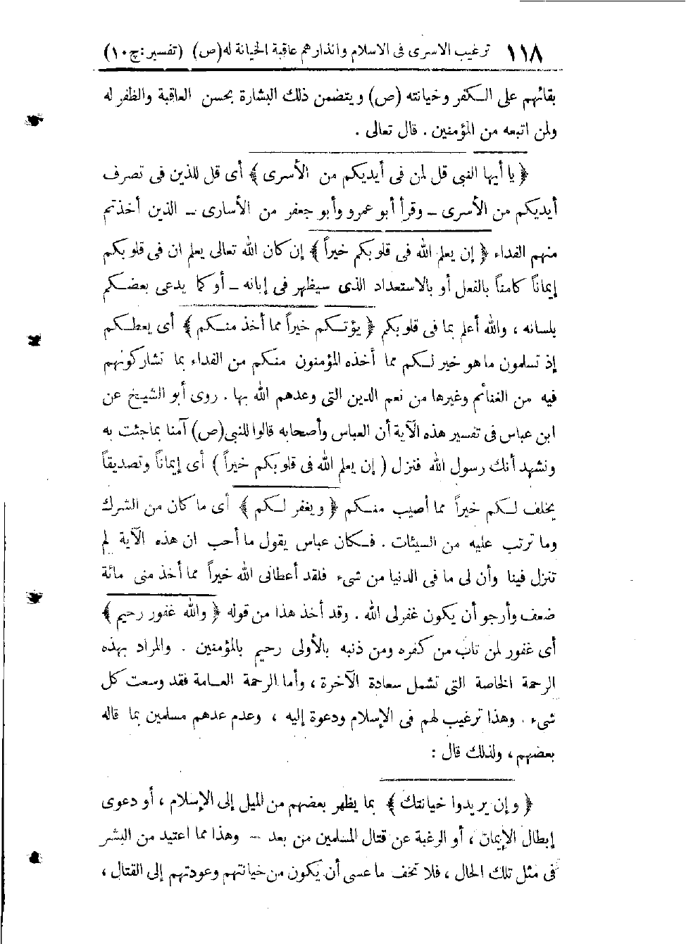 (1، 2، 3) وَقَوْلُهُ تَعَالَى: سَأُلْقِي فِي قُلُوبِ الَّذِينَ كَفَرُوا الرُّعْبَ (12) أَيْ: عِنْدَ لِقَاءِ الْمُؤْمِنِينَ فِي الْقِتَالِ، وَمَا عَلَّلَهُ بِهِ بَعْدَهُ مِنْ مُشَاقَّتِهِمْ لِلَّهِ وَلِرَسُولِهِ، وَتَوَعُّدِهِمْ بِعَذَابِ النَّارِ، فَهَذِهِ ثَلَاثُ آيَاتٍ فِي حَالِهِمْ وَمَآلِهِمْ، وَقَدْ ثَبَتَ أَنَّهُ كَانَ مِنْ خَصَائِصِهِ ـ صَلَّى اللَّهُ عَلَيْهِ وَسَلَّمَ ـ أَنَّهُ يُنْصَرُ بِالرُّعْبِ، ثَبَتَ هَذَا نَصًّا، وَثَبَتَ فِعْلًا، وَكَانَ لِلْمُسْلِمِينَ حَظٌّ مِنْ إِرْثِهِ ـ صَلَّى اللَّهُ عَلَيْهِ وَسَلَّمَ ـ بِقَدْرِ مَا كَانَ مِنْ إِرْثِهِمْ لِهِدَايَتِهِ.