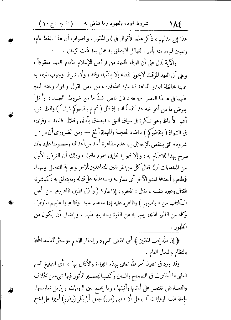 فَهَذِهِ الْآيَاتُ بِمَعْنَى آيَاتِ أَوَّلِ سُورَةِ الْعَنْكَبُوتِ وَآيَتَيِ الْبَقَرَةِ وَآلِ عِمْرَانَ اللَّتَيْنِ أَشَرْنَا إِلَيْهِمَا وَإِلَى مَا تَقَدَّمَ مِنْ تَفْسِيرِهِمَا، فَلْيَرْجِعْ إِلَيْهِ مَنْ شَاءَ الْوُقُوفَ عَلَى مَا فِيهِمَا مِنَ الْعِلْمِ وَالْعِبْرَةِ وَالْمُوَازَنَةِ بَيْنَ مُسْلِمِي عَصْرِنَا، وَمُسْلِمِي الْعَصْرِ الْأَوَّلِ. وَقَدْ ثَبَتَ بِالِاخْتِبَارِ أَنَّ لِلْحُرُوبِ - عَلَى مَا يَكُونُ فِيهَا مِنَ الْعُدْوَانِ وَالشُّرُورِ - فَوَائِدُ عَظِيمَةٌ فِي تَرْقِيَةِ الْأُمَمِ، وَرَفْعِ شَأْنِهَا بِقَدْرِ اسْتِعْدَادِهَا، وَنَاهِيكَ بِالْحَرْبِ إِذَا الْتُزِمَ فِيهَا مَا قَرَّرَهُ الْإِسْلَامُ مِنْ إِحْقَاقِ الْحَقِّ وَإِبْطَالِ الْبَاطِلِ، وَمُرَاعَاةِ قَوَاعِدِ الْعَدْلِ وَالْفَضِيلَةِ. كَاحْتِرَامِ الْعُهُودِ، وَتَحْرِيمِ الْخِيَانَةِ، وَتَقْدِيرِ الضَّرُورَةِ فِيهَا بِقَدْرِهَا، وَوَضْعِ كُلٍّ مِنَ الشِّدَّةِ وَالرَّحْمَةِ فِي مَوْضِعِهَا، كَمَا تَقَدَّمَ بَيَانُهُ فِي تَفْسِيرِ آيَاتِ هَذِهِ السُّورَةِ، وَآيَاتِ سُورَةِ الْأَنْفَالِ قَبْلَهَا، وَكَذَا آيَاتِ الْقِتَالِ مِنْ سُورَتَيِ الْبَقَرَةِ وَآلِ عِمْرَانَ، وَكَذَلِكَ كَانَ الْمُسْلِمُونَ الْأَوَّلُونَ فِي جَمِيعِ حُرُوبِهِمْ عَلَى تَفَاوُتٍ بَيْنَ سَلَفِهِمْ وَخَلَفِهِمْ، وَقَدْ شَهِدَ لَهُمْ بِذَلِكَ عُلَمَاءُ التَّارِيخِ وَالِاجْتِمَاعِ مِنَ الْإِفْرِنْجِ الْمُنْصِفِينَ عَلَى قِلَّتِهِمْ، حَتَّى قَالَ حَكِيمٌ كَبِيرٌ مِنْهُمْ: مَا عَرَفَ التَّارِيخُ فَاتِحًا أَعْدَلَ وَلَا أَرْحَمَ مِنَ الْعَرَبِ.