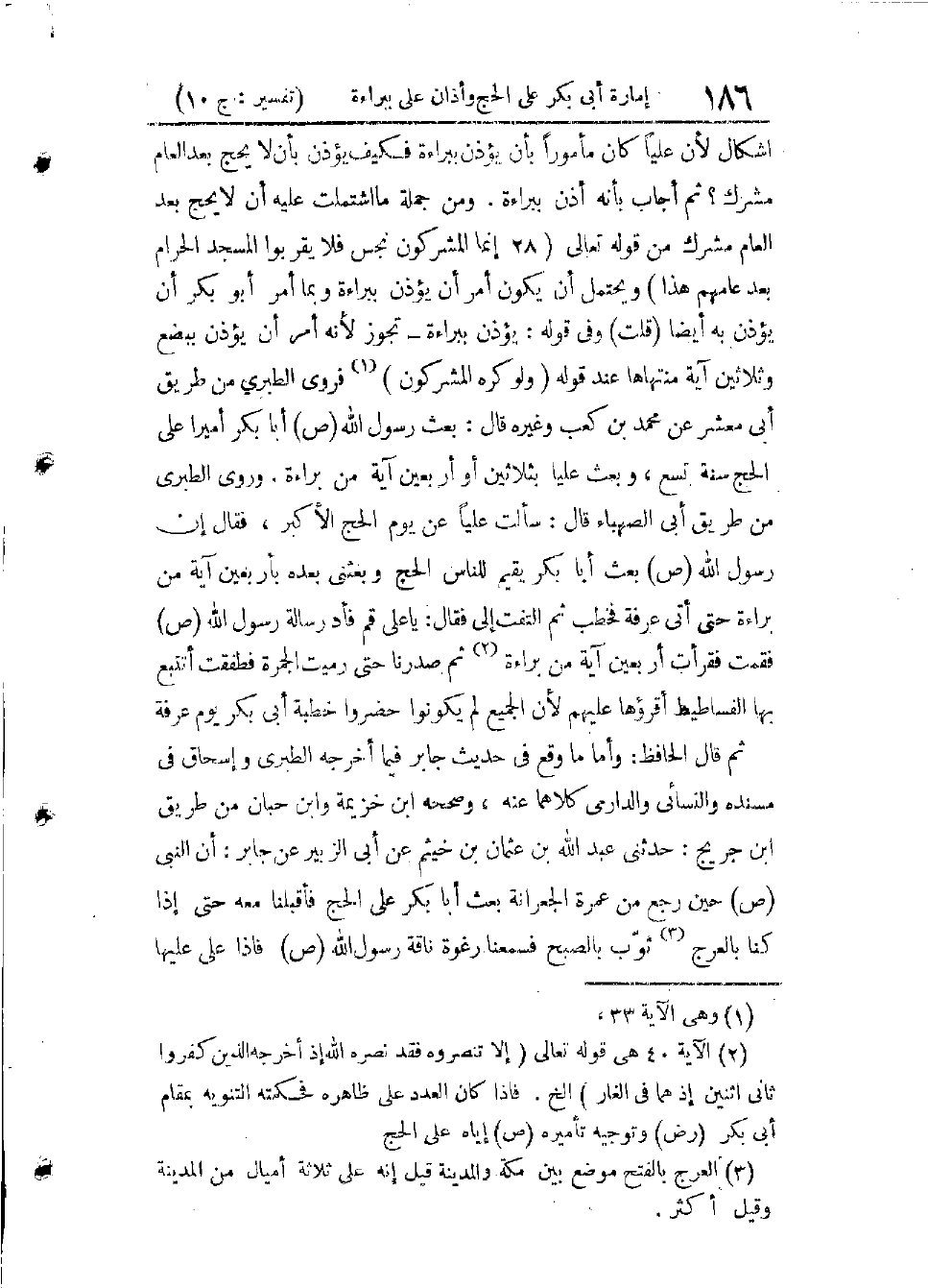 نَهَارٍ وَلَمْ تَحِلَّ لِأَحَدٍ قَبْلَهُ، وَلَنْ تَحِلَّ لِأَحَدٍ بَعْدَهُ؟ فَعُلِمَ مِنْ هَذَا أَنَّ مَنْعَ عِبَادَةِ الشِّرْكِ مِنَ الْمَسْجِدِ الْحَرَامِ، وَإِبْطَالَ مَا كَانَ الْمُشْرِكُونَ يَدَّعُونَهُ وَيَفْخَرُونَ بِهِ مَنْ حَقِّ عِمَارَتِهِ الْحِسِّيَّةِ وَإِيئَاسِهِمْ مِنَ الِاشْتِرَاكِ فِيهَا، كَانَ يَتَوَقَّفُ عَلَى مَا ذُكِرَ مِنْ نَبْذِ عُهُودِهِمْ، وَمِنَ الْعَدْلِ الْوَاجِبِ فِي الْإِسْلَامِ إِعْلَامُهُمْ بِذَلِكَ قَبْلَ تَنْفِيذِهِ بِزَمَنٍ طَوِيلٍ يَكْفِي لِعِلْمِ الْجَمَاهِيرِ مِنْهُمْ بِهِ، وَهَذَا الْمَنْعُ هُوَ مَا تَضَمَّنَتْهُ هَاتَانِ الْآيَتَانِ عَلَى أَكْمَلِ وَجْهٍ، وَفَسَّرَهُ عَلِيٌّ كَرَّمَ اللهُ وَجْهَهُ بِأَمْرِ النَّبِيِّ ـ صَلَّى اللَّهُ عَلَيْهِ وَسَلَّمَ ـ مِنَ الْجِهَةِ الْخَاصَّةِ، فَحَسُنَ أَنْ يُوضَعَ هُوَ وَمَا يَتْلُوهُ بَعْدَ آيَاتِ ذَلِكَ النَّبْذِ وَالْأَذَانِ، وَمَا تَلَاهُ مِنَ التَّهْدِيدِ بِالْقِتَالِ بَعْدَ عَوْدِ حَالَتِهِ إِلَى مَا كَانَتْ عَلَيْهِ قَبْلَ الْعُهُودِ. وَهُوَ الْمَقْصُودُ بِالذَّاتِ بِقِسْمَيْهِ السَّلْبِيِّ وَالْإِيجَابِيِّ وَسَيَأْتِي النَّهْيُ عَنْ تَمْكِينِهِمْ مِنَ الْقُرْبِ مِنَ الْمَسْجِدِ الْحَرَامِ أَيْضًا فِي الْآيَةِ (28) قَالَ تَعَالَى: مَا كَانَ لِلْمُشْرِكِينَ أَنْ يَعْمُرُوا مَسَاجِدَ اللهِ النَّفْيُ فِي مِثْلِ هَذَا التَّعْبِيرِ يُسَمَّى نَفْيَ الشَّأْنِ، كَمَا سَبَقَ بَيَانُهُ فِي نَظَائِرِهِ مَعَ بَيَانِ أَنَّهُ أَبْلَغُ مِنْ نَفْيِ الْفِعْلِ طَبْعًا أَوْ شَرْعًا؛ لِأَنَّهُ نَفْيٌ لَهُ بِالدَّلِيلِ، وَالْمَسَاجِدُ: جَمْعُ مَسْجِدٍ، وَهُوَ فِي اللُّغَةِ مَكَانُ السُّجُودِ، وَقَدْ