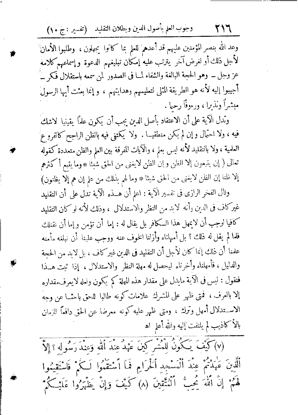 وَلَهُ مِنَ الْعِبْرَةِ فِي الْآيَةِ التَّالِيَةِ مَا يَجْعَلُ هَذِهِ الْمَعَانِيَ الْمَعْقُولَةَ مُشَاهَدَةً مَاثِلَةً، وَالدَّلَائِلَ الشَّرْعِيَّةَ وَقَائِعَ حِسِّيَّةً، فِي آثَارِ النَّبِيِّ الْمُخْتَارِ، وَإِيثَارِ الْأَنْصَارِ، وَالْفَرْقِ بَيْنَ الْمُؤْمِنِينَ الرَّاسِخِينَ مِنْهُمْ وَمِنَ الْمُهَاجِرِينَ، وَبَيْنَ الْمُؤَلَّفَةِ قُلُوبُهُمْ وَالْمُنَافِقِينَ، فِيمَا كَانَ مِنْ خِذْلَانٍ وَهَزِيمَةٍ، وَمِنْ نَصْرٍ وَغَنِيمَةٍ.