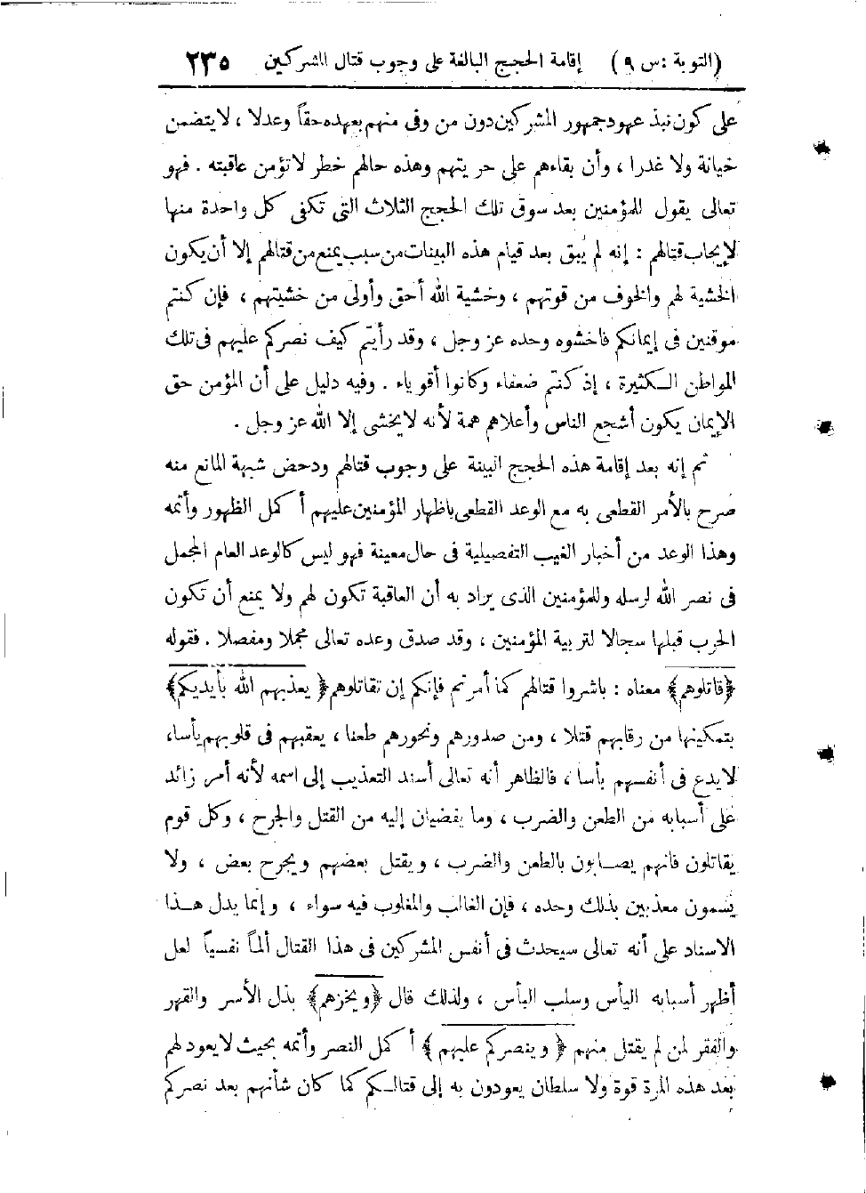 ثُمَّ زَعَمَ أَنَّ قَوْلَهُ تَعَالَى: ثُمَّ أَنْزَلَ اللهُ سَكِينَتَهُ عَلَى رَسُولِهِ وَعَلَى الْمُؤْمِنِينَ خَاصٌّ بِهَؤُلَاءِ الَّذِينَ ثَبَتُوا مَعَهُ ـ صَلَّى اللَّهُ عَلَيْهِ وَسَلَّمَ ـ فَيُقَالُ لَهُ: وَلِمَاذَا عَطَفَ عَلَى مَا قَبْلَهُ بِثُمَّ الدَّالَّةِ عَلَى التَّرَاخِي؟ أَلَيْسَ دَلِيلًا عَلَى أَنَّ الرَّسُولَ وَالَّذِينَ ثَبَتُوا مَعَهُ كَانُوا قَدِ اضْطَرَبُوا عِنْدَ اضْطِرَابِ الْجُمْهُورِ فِي تِلْكَ الْهَزِيمَةِ؟ أَوَلَيِسَ نُزُولُ السَّكِينَةِ لَازِمًا أَوْ مَلْزُومًا لِعَوْدَةِ الْمُهَاجِرِينَ وَالْأَنْصَارِ مِنْ أَهْلِ بَيْعَةِ الرِّضْوَانِ تَحْتَ الشَّجَرَةِ إِلَى الْقِتَالِ؟ وَهَلْ عَادُوا إِلَّا بَعْدَ أَنْ زَالَ ذَلِكَ الِاضْطِرَابُ وَاخْتِلَاطُ الْأَمْرِ الَّذِي عَرَضَ لَهُمْ بِفِرَارِ الْمُؤَلَّفَةِ قُلُوبُهُمْ؟ وَهَلْ زَالَ ذَلِكَ إِلَّا بِمَا أَنْزَلَ اللهُ عَلَيْهِمْ مِنَ السَّكِينَةِ لَمَّا سَمِعُوا نِدَاءَ الرَّسُولِ ـ صَلَّى اللَّهُ عَلَيْهِ وَسَلَّمَ ـ وَنِدَاءَ الْعَبَّاسِ ـ رَضِيَ اللهُ عَنْهُ ـ وَعَلِمُوا مَكَانَهُ ـ صَلَّى اللَّهُ عَلَيْهِ وَسَلَّمَ ـ؟ وَهَلْ يَكُونُ أَصْحَابُ هَذِهِ الْكَرَّةِ النَّاهِضَةِ بَعْدَ تِلْكَ الْفَرَّةِ الْعَارِضَةِ وَهُمْ أَصْحَابُ الْمَوَاقِفِ السَّابِقَةِ وَالْفُتُوحَاتِ اللَّاحِقَةِ