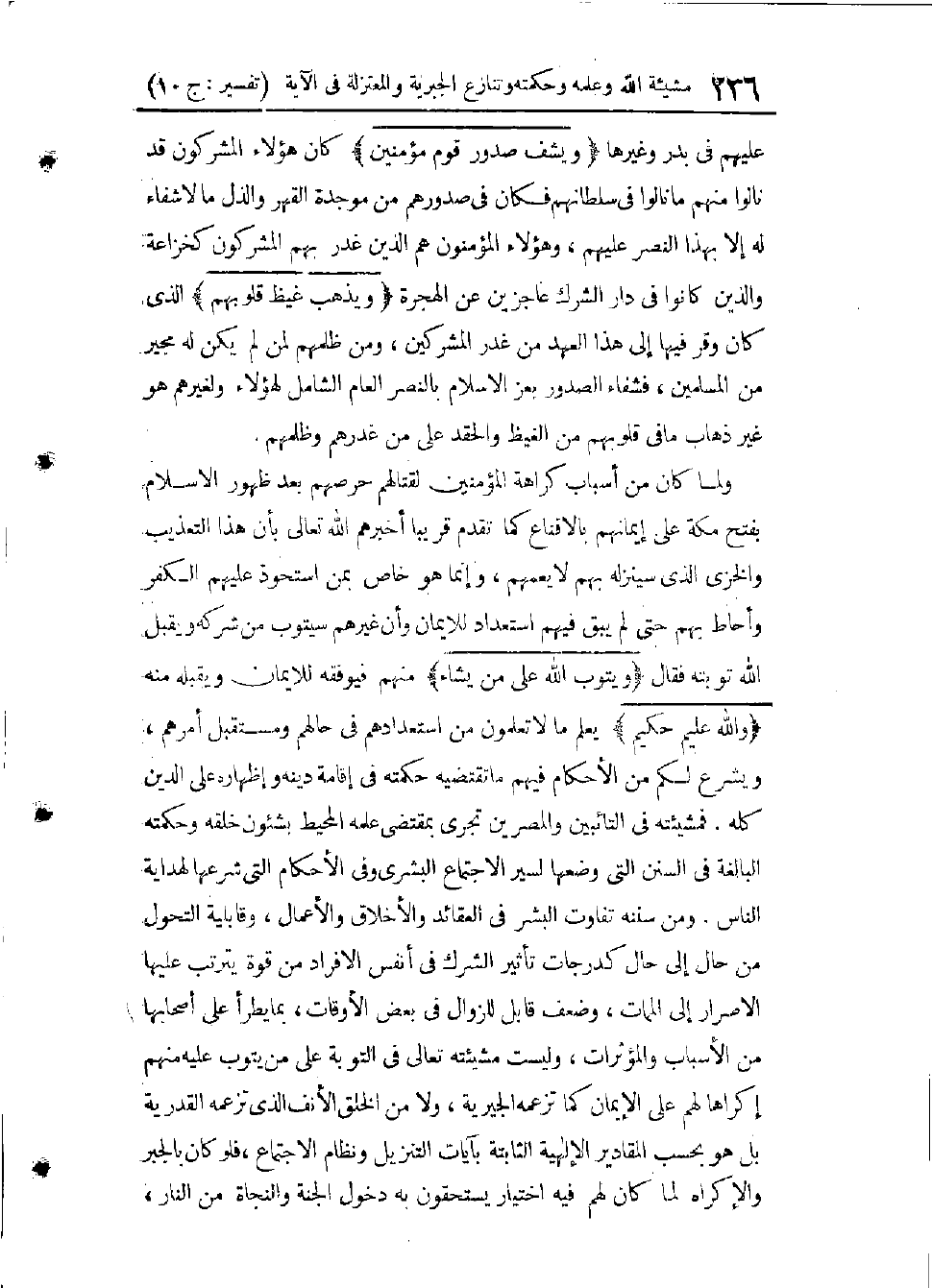 فَأَيْنَ مَا بَايَعْتُمْ بِهِ اللهَ سُبْحَانَهُ، وَمَا أَعْطَيْتُمُوهُ مِنَ الْعَهْدِ وَالْمِيثَاقِ يَوْمَ بَيْعَةِ الرِّضْوَانِ عَلَى أَلَّا تَفِرُّوا عَنْهُ، وَمَنْ فَرَّ فَهُوَ فِي النَّارِ، وَمَنْ قُتِلَ فَهُوَ شَهِيدٌ؟ فَمَا وَفَيْتُمْ بِبَيْعِكُمُ الَّذِي بَايَعْتُمْ بِهِ سُبْحَانَهُ (كَذَا) إِذْ يَقُولُ: إِنِ اللهَ اشْتَرَى مِنَ الْمُؤْمِنِينَ أَنْفُسَهُمْ وَأَمْوَالَهُمْ بِأَنَّ لَهُمُ الْجَنَّةَ يُقَاتِلُونَ فِي سَبِيلِ اللهِ فَيَقْتُلُونَ وَيُقْتَلُونَ وَعْدًا عَلَيْهِ حَقًّا (9: 111) أَنْقَضْتُمُ الْعَهْدَ؟ أَمِ اسْتَقَلْتُمُ الْبَيْعَ " ثُمَّ وَلَّيْتُمْ مُدْبِرِينَ (9: 25) غَيْرَ مُتَحَرِّفِينَ لِقِتَالٍ، وَلَا مُتَحَيِّزِينَ إِلَى فِئَةٍ وَمَنْ يَفْعَلْ ذَلِكَ فَقَدْ بَاءَ بِغَضَبٍ مِنَ اللهِ (8: 16) انْتَهَى. بِحُرُوفِهِ وَتَحْرِيفِهِ لِكَلَامِ اللهِ تَعَالَى إِذْ جَعَلَ ذَلِكَ كُلَّهُ تَفْسِيرًا لِآيَةِ يَوْمِ حُنَيْنٍ الَّتِي لَمْ تَكُنْ إِلَّا تَذْكِيرًا لِلْمُؤْمِنِينَ بِعِنَايَةِ اللهِ تَعَالَى بِهِمْ وَنَصْرِهِ إِيَّاهُمْ عَلَى مَا وَقَعَ فِيهِمْ مِنَ الِاضْطِرَابِ وَالتَّوَلِّي فِي أَوَّلِ الْمَعْرَكَةِ، وَقَدْ أَرَادَ بِهَذَا التَّحْرِيفِ أَنْ يَهْدِمَ كُلَّ