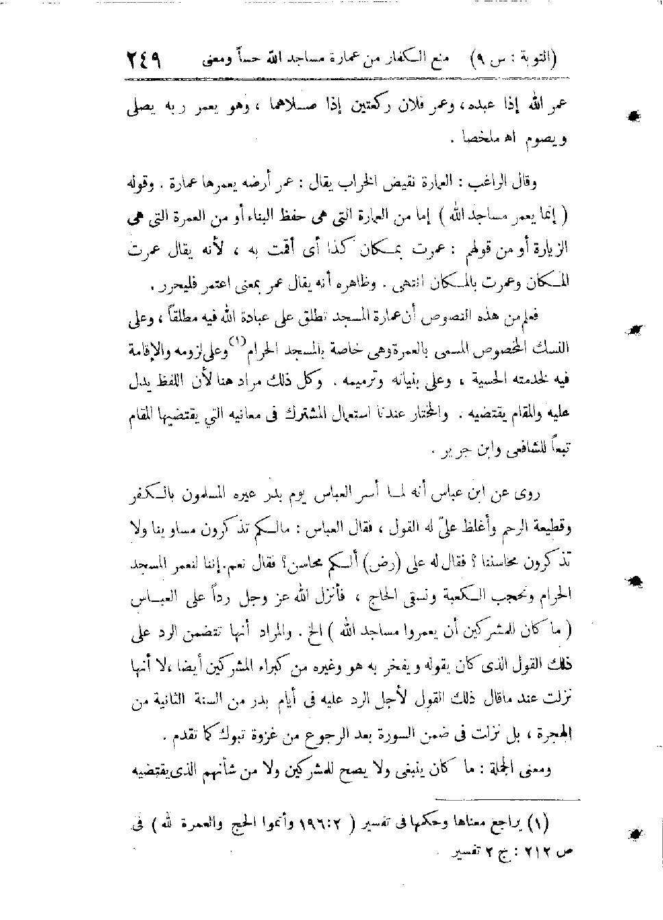 وَإِنَّكَ تَرَى فِي بَعْضِ كُتُبِ التَّفْسِيرِ الْمُتَدَاوَلَةِ أَنَّ هَذِهِ الْآيَةَ تَدُلُّ عَلَى عَدَمِ إِيمَانِ أَهْلِ الْكِتَابِ بِاللهِ وَالْيَوْمِ الْآخِرِ إِلَخْ. وَزَعَمَ بَعْضُهُمْ أَنَّهَا نَصٌّ فِي ذَلِكَ، وَغَرَضُهُمْ مِنْ هَذَا أَنَّ هَذِهِ الصِّفَاتِ لَيْسَتْ قُيُودًا فِي شَرْعِيَّةِ قِتَالِهِمْ بَلْ هِيَ بَيَانٌ لِلْوَاقِعِ لَا مَفْهُومَ لَهَا، فَلَا يُقَالُ: إِنَّهُ إِذَا وَجَدَ مِنْ أَهْلِ الْكِتَابِ مَنْ يُؤْمِنُ بِاللهِ وَالْيَوْمِ الْآخِرِ وَيُحَرِّمُ مَا حَرَّمَ اللهُ وَرَسُولُهُ إِلَيْهِمْ - عَلَى الْمُخْتَارِ مِنْ أَنَّ الْمُرَادَ بِالرَّسُولِ عِنْدَ كُلٍّ مِنْهُمْ رَسُولُهُمْ، وَيَدِينُ دِينَ الْحَقِّ بِاعْتِقَادِهِمْ - فَإِنَّهُمْ لَا يَدْخُلُونَ فِي هَذَا الْحُكْمِ، وَقَالُوا: إِنَّ أُولَئِكَ الَّذِينَ دَلَّتْ آيَةُ سُورَةِ الْبَقَرَةِ عَلَى إِقَامَتِهِمْ لِأَرْكَانِ الدِّينِ الْإِلَهِيِّ هُمُ الَّذِينَ كَانُوا مُتَّبِعِينَ لِأَنْبِيَائِهِمْ فِي زَمَانِهِمْ، أَوْ قَبْلَ تَحْرِيفِهِمْ لِكِتَابِهِمْ، وَالِابْتِدَاعِ فِي دِينِهِمْ حَتَّى الشِّرْكِ، أَوِ الَّذِينَ اتَّبَعُوا خَاتَمَ الرُّسُلِ الَّذِي نَسَخَ كِتَابُهُ الْكُتُبَ الَّتِي قَبْلَهُ، وَالشَّرَائِعَ الْمُخَالِفَةَ لِشَرْعِهِ بَعْدَ بِعْثَتِهِ وَبُلُوغِ دَعْوَتِهِ، وَقَدْ بَيَّنَّا هَذِهِ الْأَقْوَالَ فِي تَفْسِيرِ تِلْكَ الْآيَةِ، وَصَرَّحَ الْفَخْرُ الرَّازِيُّ بِأَنَّ هَذِهِ الصِّفَاتِ السَّلْبِيَّةَ قُيُودٌ تُشْتَرَطُ فِي قِتَالِهِمْ، وَلَكِنَّهُمْ فَاقِدُونَ لَهَا، فَإِنْ وُجِدَ مِنْهُمْ قَوْمٌ مُتَّصِفُونَ بِهَا حَرُمَ عَلَيْنَا بَدْؤُهُمْ بِالْقِتَالِ.
