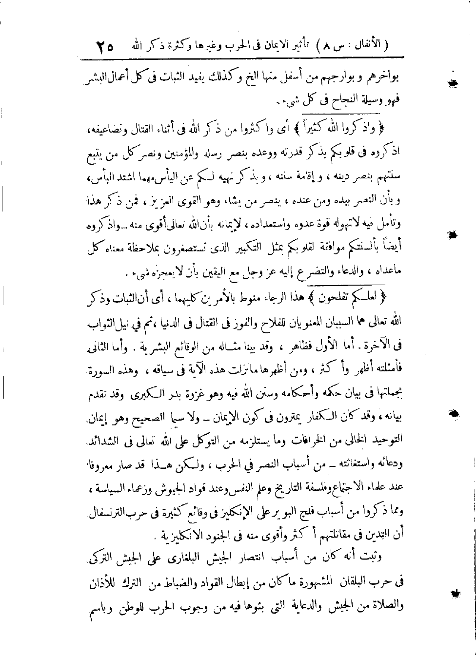 مِنْهَا أَبُو سُفْيَانَ - بَطِرِينَ بِمَا أُوتُوا مِنْ قُوَّةٍ وَنِعَمٍ لَمْ يَسْتَحِقُّوهَا، أَوْ كَفَرُوا نِعْمَةَ اللهِ - مُرَائِينَ لِلنَّاسِ بِهَا، لِيُعْجَبُوا بِهِمْ، وَيُثْنُوا عَلَيْهِمْ بِالْغِنَى وَالْقُوَّةِ وَالشَّجَاعَةِ وَالْمَنَعَةِ وَيَصُدُّونَ عَنْ سَبِيلِ اللهِ أَيْ: وَالْحَالُ أَنَّهُمْ يَصُدُّونَ بِخُرُوجِهِمْ عَنْ سَبِيلِ اللهِ - وَهُوَ الْإِسْلَامُ - بِحَمْلِ النَّاسِ عَلَى عَدَاوَةِ الرَّسُولِ ـ صَلَّى اللَّهُ عَلَيْهِ وَسَلَّمَ ـ وَالْإِعْرَاضِ عَنْ تَبْلِيغِ دَعَوْتِهِ، وَتَعْذِيبِ مَنْ أَجَابَهَا إِذَا لَمْ يَكُنْ لَهُ مَنْ يَمْنَعُهُمْ وَيَحْمِيهِمْ مِنْ قَرَابَةٍ أَوْ حِلْفٍ أَوْ جِوَارٍ وَاللهُ بِمَا يَعْمَلُونَ مُحِيطٌ عِلْمًا وَسُلْطَانًا، فَهُوَ يُجَازِيهِمْ عَلَيْهِ فِي الدُّنْيَا وَالْآخِرَةِ بِمُقْتَضَى سُنَّتِهِ فِي تَرْتِيبِ الْجَزَاءِ عَلَى صِفَاتِ النَّفْسِ.
