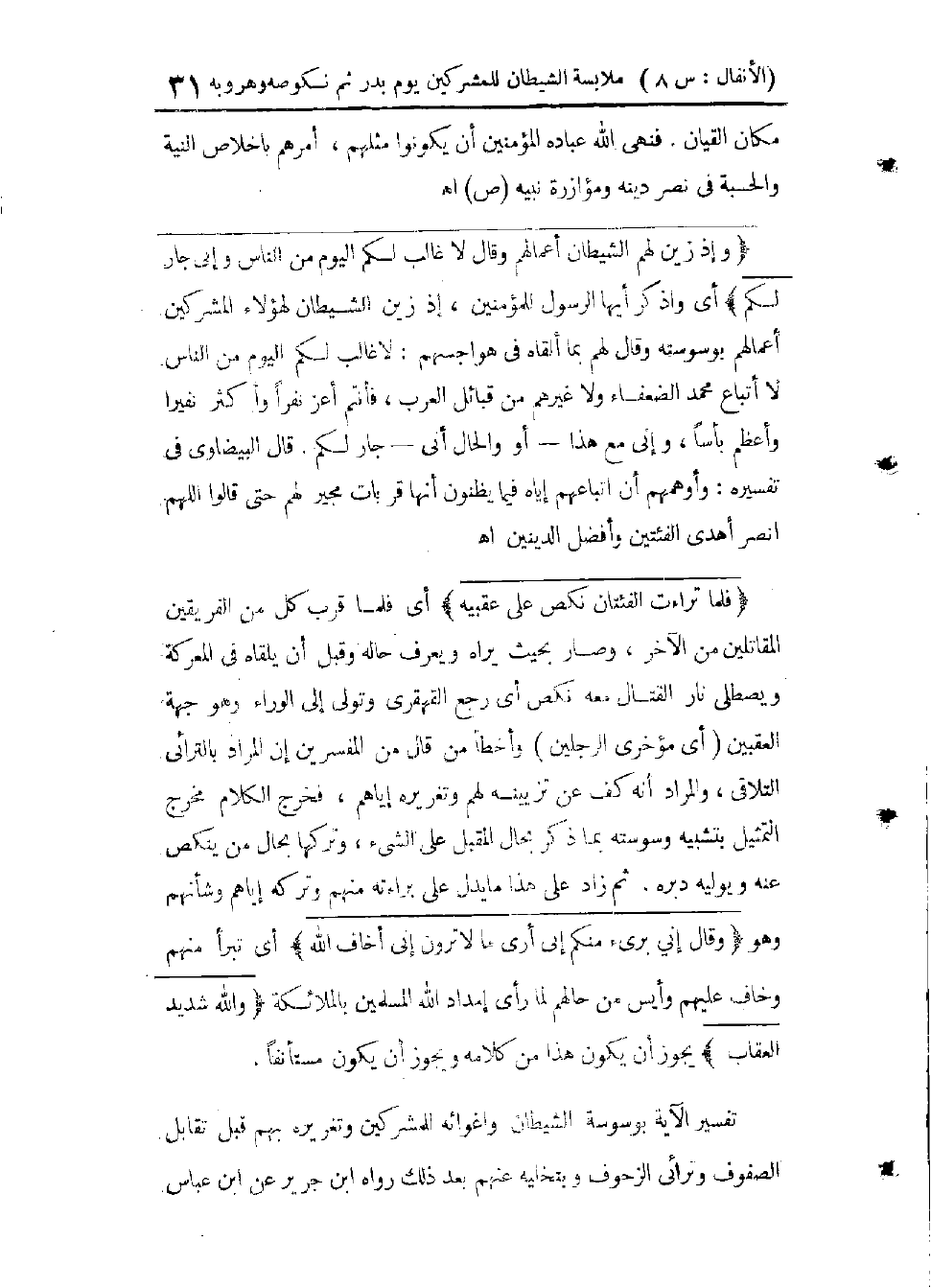 وَلَوْ تَرَى إِذْ يَتَوَفَّى الَّذِينَ كَفَرُوا الْمَلَائِكَةُ هَذَا بَيَانٌ لِبَعْضِ مَضْمُونِ قَوْلِهِ تَعَالَى فِي الْآيَةِ الَّتِي قَبْلَ الْأَخِيرَةِ: وَاللهُ شَدِيدُ الْعِقَابِ وَمَعْنَاهُ: وَلَوْ رَأَيْتَ أَيُّهَا الرَّسُولُ - أَوِ الْخِطَابُ لِكُلِّ مِنْ سَمِعَهِ أَوْ يَتْلُوهُ - إِذْ يَتَوَفَّى الَّذِينَ كَفَرُوا مِنْ قَتْلَى بَدْرٍ وَغَيْرِهِمْ (وَمَعْلُومٌ أَنْ " لَوْ " الِامْتِنَاعِيَّةَ تَرُدُّ الْمُضَارِعَ مَاضِيًا) مَلَائِكَةُ الْعَذَابِ حَالَةَ كَوْنِهِمْ يَضْرِبُونَ وُجُوهَهُمْ وَأَدْبَارَهُمْ أَيْ: ظُهُورَهُمْ وَأَقْفِيَتَهُمْ بِجُمْلَتِهَا - وَهُوَ ضَرْبٌ مِنْ عَالَمِ الْغَيْبِ بِأَيْدِي الْمَلَائِكَةِ، فَلَا يَقْتَضِي أَنْ يَرَاهُ النَّاسُ الَّذِينَ