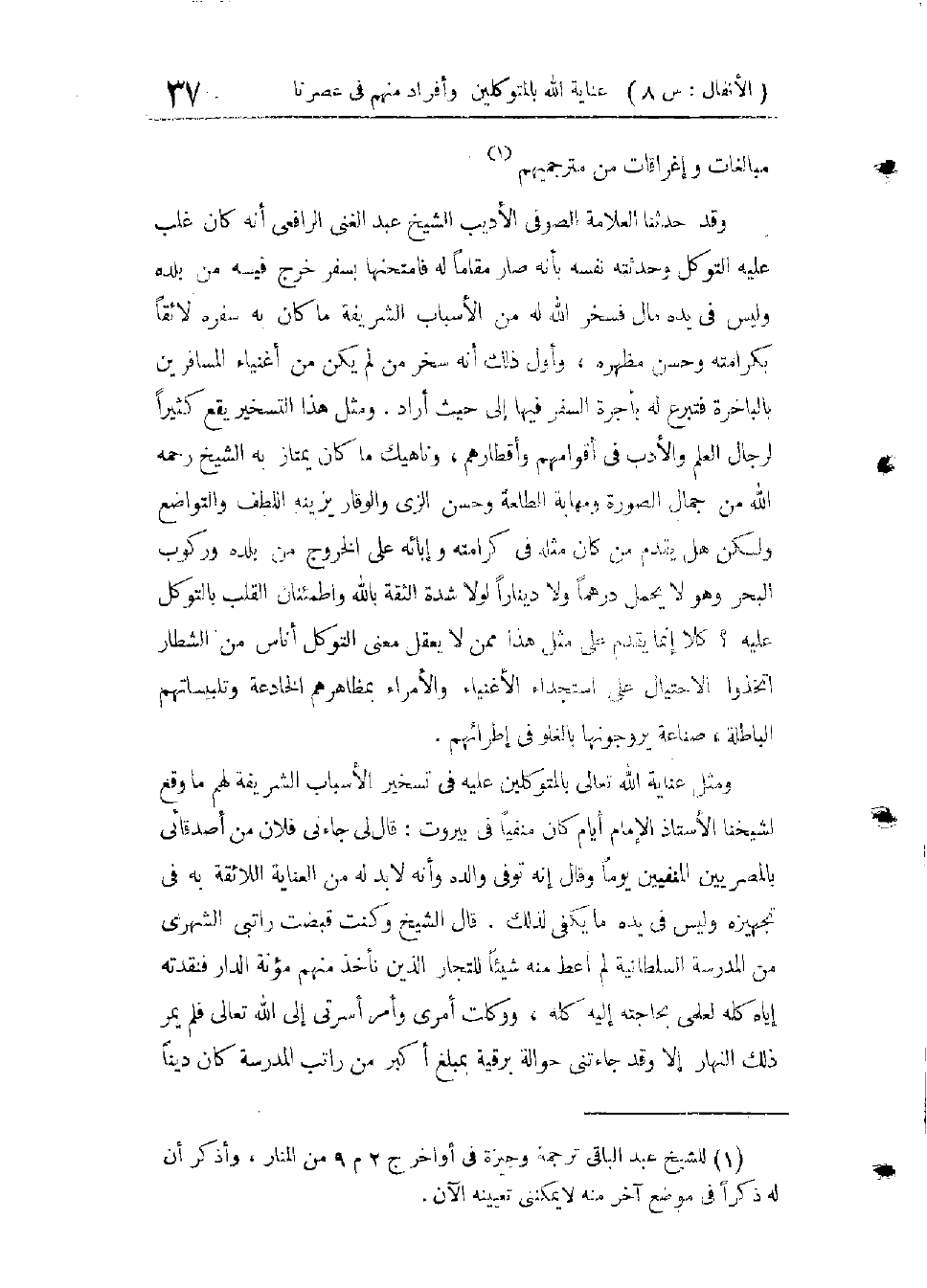 وَمَا كَانَ يَخْطُرُ بِبَالِ أَحَدٍ أَنَّ هَذِهِ الشِّرْذِمَةَ الْقَلِيلَةَ تُزَعْزِعُ أَرْكَانَ تِلْكَ الدُّوَلِ الْعَظِيمَةِ، وَتَمْحُو أَسْمَاءَهَا مِنْ لَوْحِ الْمَجْدِ. وَمَا كَانَ يَخْتَلِجُ بِصَدْرٍ أَنَّ هَذِهِ الْعِصَابَةَ الصَّغِيرَةَ تَقْهَرُ تِلْكَ الْأُمَمَ الْكَبِيرَةَ، وَتُمَكِّنُ فِي نُفُوسِهَا عَقَائِدَ دِينِهَا، وَتُخْضِعُهَا لِأَوَامِرِهَا وَعَادَاتِهَا وَشَرَائِعِهَا، لَكِنْ كَانَ كُلُّ ذَلِكَ، وَنَالَتْ تِلْكَ الْأُمَّةُ الْمَرْحُومَةُ عَلَى ضَعْفِهَا مَا لَمْ تَنَلْهُ أُمَّةٌ سِوَاهَا. نَعِمَ قَوْمٌ صَدَقُوا مَا عَاهَدُوا اللهَ عَلَيْهِ فَوَفَّاهُمْ أُجُورَهُمْ مَجْدًا فِي الدُّنْيَا، وَسَعَادَةً فِي الْآخِرَةِ.