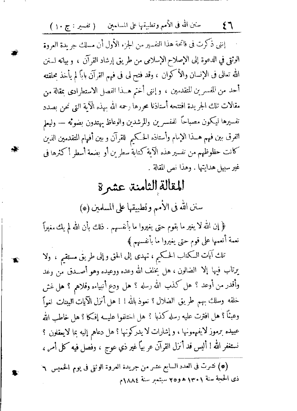 وَفِي هَذِهِ الْآيَةِ دَلِيلٌ عَلَى أَنَّ مَا أَوْجَبَهُ الْإِسْلَامُ مِنَ الْمُحَافَظَةِ عَلَى الْعُهُودِ مَعَ الْمُحَالِفِينَ مِنْ أَعْدَائِهِ الْمُخَالِفِينَ لَهُ فِي الدِّينِ: وَمَا حَرَّمَهُ مِنَ الْخِيَانَةِ لَهُمْ فِيهَا، وَمَا شَرَعَهُ مِنَ الْعَدْلِ وَالصَّرَاحَةِ فِي مُعَامَلَتِهِمْ - لَيْسَ عَنْ ضَعْفٍ وَلَا عَنْ عَجْزٍ، بَلْ عَنْ قُوَّةٍ وَتَأْيِيدٍ إِلَهِيٍّ، وَقَدْ نَصَرَ اللهُ تَعَالَى الْمُسْلِمِينَ عَلَى الْيَهُودِ الْخَائِنِينَ النَّاقِضِينَ لِعُهُودِهِمْ، وَثَبَتَ بِهَذَا أَنَّ قِتَالَ الْمُسْلِمِينَ لَهُمْ وَإِجْلَاءَهُمْ لِبَقِيَّةِ السَّيْفِ مِنْهُمْ مَنْ جِوَارِ عَاصِمَةِ الْإِسْلَامِ ثُمَّ مِنْ مَهْدِهِ وَمَعْقِلِهِ (الْحِجَازِ) كَانَ عَدْلًا وَحَقًّا. (فُصُولٌ فِي الْمُعَامَلَةِ بَيْنَ النَّبِيِّ ـ صَلَّى اللَّهُ عَلَيْهِ وَسَلَّمَ ـ وَيَهُودِ الْمَدِينَةِ فِي السَّلْمِ وَالْحَرْبِ)