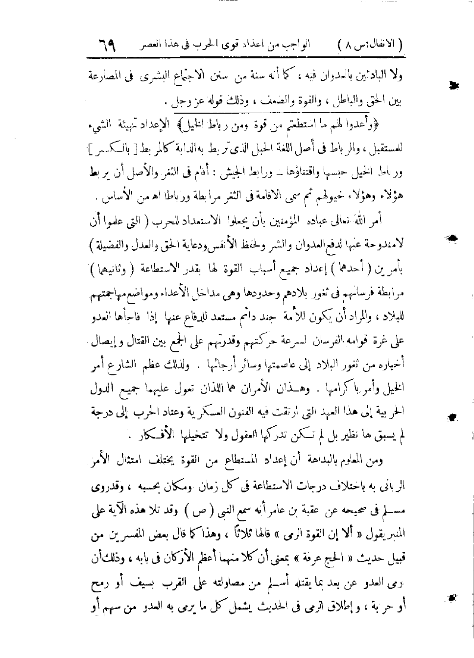 سِيَاقِ الْحَرْبِ وَغَزْوَةِ بَدْرٍ، وَقَدْ أَحَلْتُ فِيهِ عَلَى تَفْسِيرِ مِثْلِ تِلْكَ الْجُمْلَةِ مِنْ سُورَةِ الْبَقَرَةِ وَهُوَ قَوْلُهُ: يَاأَيُّهَا الَّذِينَ آمَنُوا اسْتَعِينُوا بِالصَّبْرِ وَالصَّلَاةِ إِنَّ اللهَ مَعَ الصَّابِرِينَ (2: 153) وَقَدْ قُلْتُ هُنَاكَ: ثُمَّ قَالَ: إِنَّ اللهَ مَعَ الصَّابِرِينَ وَلَمْ يَقُلْ مَعَكُمْ، لِيُفِيدَ أَنَّ مَعُونَتَهُ إِنَّمَا تَمُدُّهُمْ إِذَا صَارَ الصَّبْرُ وَصْفًا لَازِمًا لَهُمْ. وَمِنَ الْمُفِيدِ أَنْ يُرَاجِعَ الْقَارِئُ تَفْسِيرَ تِلْكَ الْآيَةِ [فِي ص30 وَمَا بَعْدَهَا ج 2 طَ الْهَيْئَةِ] فَإِنَّهُ يُفِيدُ فِي إِتْمَامِ مَعْنَى مَا هُنَا.