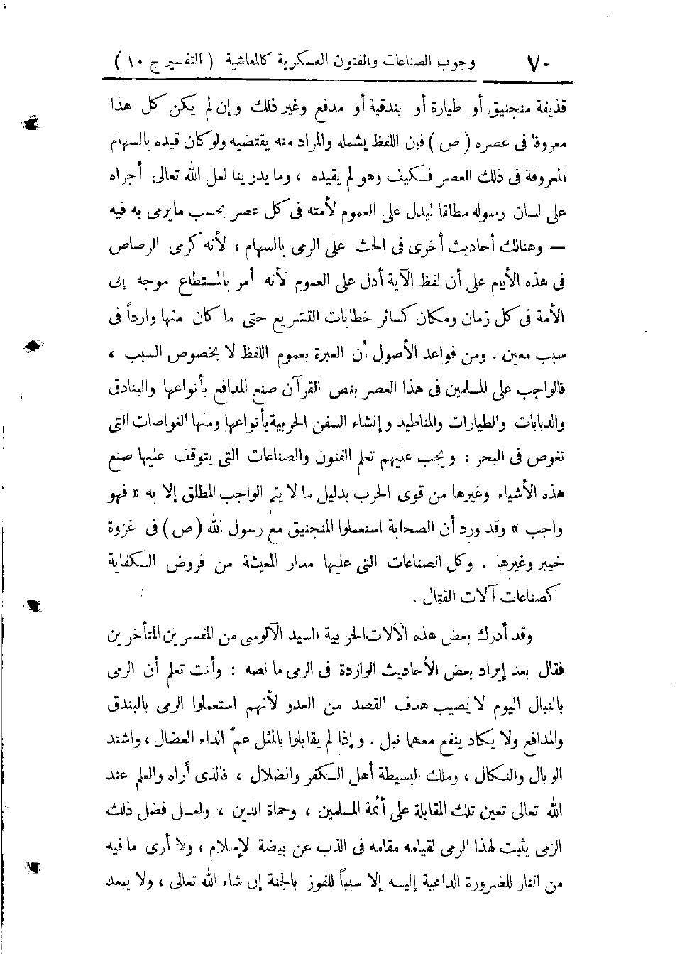 الْقِصَّةُ عِنْدَهُ مُسْنَدَةٌ بَلْ مُعْضَلَةٌ وَصَنِيعُ ابْنُ إِسْحَاقَ وَتَبِعَهُ الطَّبَرَانِيُّ وَابْنُ مَرْدَوَيْهِ يَقْتَضِي أَنَّهَا مَوْصُولَةٌ، وَالْعِلْمُ عِنْدَ اللهِ تَعَالَى اهـ. وَأَقُولُ: حَسْبُنَا أَنَّ الْحَافِظَ لَمْ يَقِفْ لَهَا عَلَى سَنَدٍ مُتَّصِلٍ، عَلَى أَنَّ النَّسْخَ فِي عُرْفِ الصَّحَابَةِ أَعَمُّ مِنَ النَّسْخِ الْمُصْطَلَحِ عَلَيْهِ فِي الْأُصُولِ، وَجُمْهُورُ الْفُقَهَاءِ يَجْعَلُونَ حُكْمَ الثَّانِيَةِ الْوُجُوبَ، وَحُكْمَ الْأُولَى النَّدْبَ، وَيَسْتَدِلُّونَ عَلَى ذَلِكَ بِتَفْسِيرِ ابْنِ عَبَّاسٍ الَّذِي جَعَلَ بَعْضُهُمْ لِرِوَايَتِهِ حُكْمَ الْحَدِيثِ الْمَرْفُوعِ، قَالَ الْحَافِظَ فِي الْفَتْحِ: وَهَذَا قَالَهُ الْحَافِظُ تَوْقِيفًا عَلَى مَا يَظْهَرُ، وَيُحْتَمَلُ أَنْ يَكُونَ قَالَهُ بِطَرِيقِ الِاسْتِقْرَاءِ اهـ. وَنَقُولُ: إِنَّ التَّوْقِيفَ مِنَ الشَّارِعِ مُسْتَبْعَدٌ أَنْ يَخْتَصَّ بِهِ ابْنَ عَبَّاسٍ الَّذِي كَانَ عِنْدَ نُزُولِ السُّورَةِ صَغِيرَ السِّنِّ، فَلَمْ يَحْضُرْ غَزْوَةَ بَدْرٍ، وَلَمْ يَسْمَعْ مِنَ النَّبِيِّ ـ صَلَّى اللَّهُ عَلَيْهِ وَسَلَّمَ ـ مَا كَانَ يَقُولُهُ فِيهَا يَوْمَئِذٍ، وَكَوْنُهُ سَمِعَهُ بَعْدَ سِنِينَ وَلَمْ يُصَرِّحْ بِسَمَاعِهِ مُسْتَبْعَدٌ جِدًّا، فَالْوَجْهُ الْمُخْتَارُ أَنَّ مَا قَالَهُ ابْنُ عَبَّاسٍ فُهِمَ مِنْهُ مَعْنَاهُ أَنَّ قِتَالَ الْمِثْلَيْنِ فَرْضٌ لَا يُنَافِي أَنَّ قِتَالَ الْعَشْرَةِ نَدْبٌ، وَقَدْ عَبَّرَ عَنْهُ بَعْضُ رُوَاتِهِ عَنْهُ بِالنَّسْخِ.