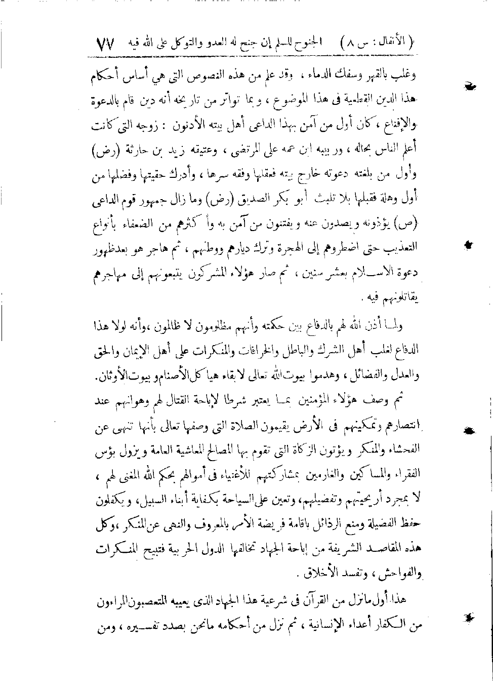الْكَهْفِ: إِنَّا جَعَلْنَا مَا عَلَى الْأَرْضِ زِينَةً لَهَا لِنَبْلُوَهُمْ أَيُّهُمْ أَحْسَنُ عَمَلًا (18: 7) وَفِي الْقُرْآنِ آيَاتٌ كَثِيرَةٌ بِهَذَا الْمَعْنَى، وَإِنَّ الَّذِي يَعْنِينَا مِنْ هَذَا الْبَحْثِ وَتَحْقِيقِ الرِّوَايَاتِ فِيهِ هُوَ تَحْقِيقُ الْمَوْضُوعِ، وَمِنْهُ كَوْنُ الَّذِينَ رَجَّحُوا مُفَادَاةَ الْأَسْرَى كَثِيرُونَ - وَبَحْثُ اجْتِهَادِ النَّبِيِّ ـ صَلَّى اللَّهُ عَلَيْهِ وَسَلَّمَ ـ وَشُمُولُ الْعِتَابِ فِي الْآيَتَيْنِ لَهُ، وَقَدْ حَاوَلَ بَعْضُ الْمُفَسِّرِينَ أَنْ يَجْعَلَ إِنْكَارَ الْقُرْآنِ خَاصًّا بِالْمُؤْمِنِينَ دُونَهُ ـ صَلَّى اللَّهُ عَلَيْهِ وَسَلَّمَ ـ وَقَالَ بَعْضُهُمْ: إِنَّ أَخْذَ الْفِدَاءِ هُوَ أَرْجَحُ الرَّأْيَيْنِ، وَأَفْضَلُ الْخُطَّتَيْنِ، وَوَجَّهَهُ ابْنُ الْقَيِّمِ فِي الْهَدْيِ بِمَا يَأْتِي مِنْ بَرَاعَتِهِ، وَسِعَةِ مَجَالِ أَدِلَّتِهِ، كَمَا يَأْتِي قَرِيبًا مَعَ تَحْقِيقِ الْحَقِّ فِيهِ بِفَضْلِ اللهِ وَمَشِيئَتِهِ.