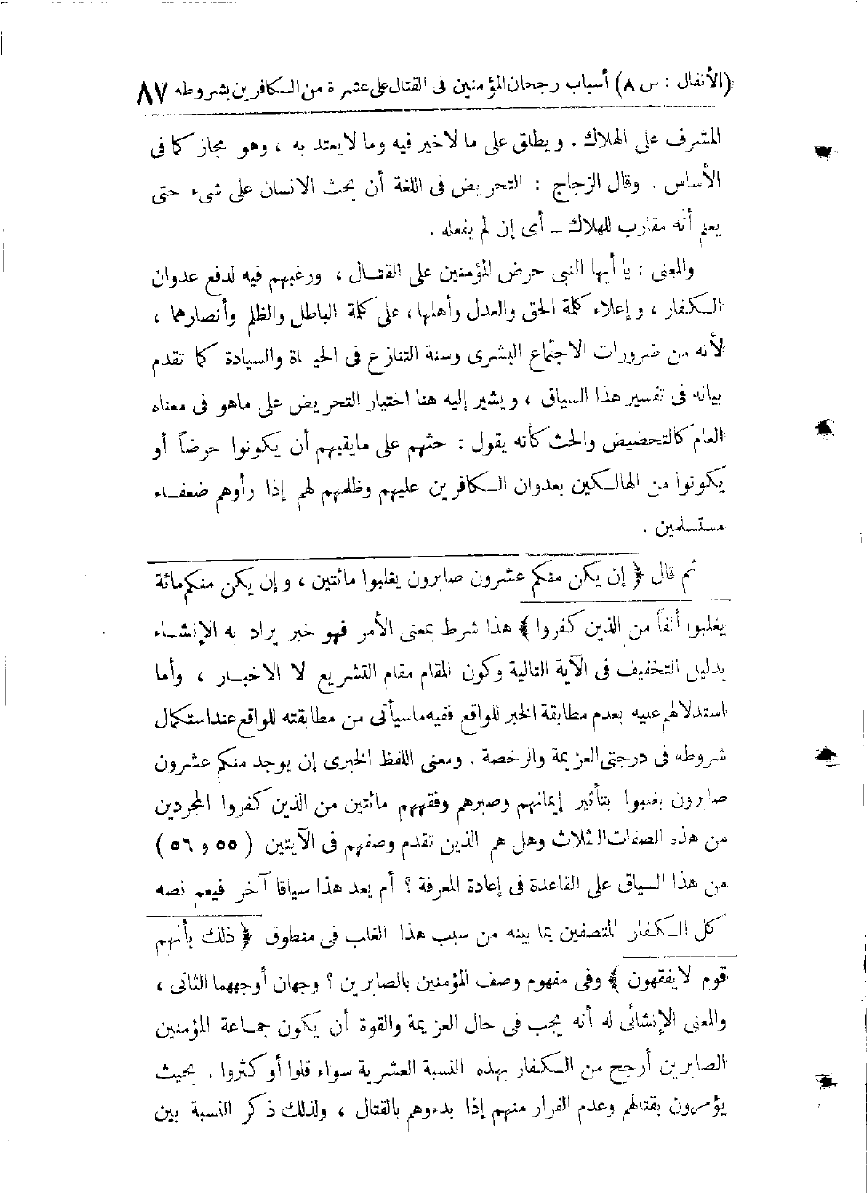 (5و6) الْمُرَجِّحَانِ الْخَامِسُ وَالسَّادِسُ: مَا حَصَلَ مِنَ الْخَيْرِ الْعَظِيمِ بِإِسْلَامِ أَكْثَرِ أُولَئِكَ الْأَسْرَى، وَخُرُوجِ مَنْ خَرَجَ مِنْ أَصْلَابِهِمْ مِنَ الْمُسْلِمِينَ، وَهَذَانِ إِنَّمَا يَدُلَّانِ عَلَى أَنَّ الْخَيْرَ فِي الَّذِي وَقَعَ كَانَ حِكْمَةً مِنْ حِكَمِ اللهِ فِي قَوْعِهِ كَمَا بَيَّنَاهُ، وَلَكِنَّهُ لَيْسَ دَلِيلًا عَلَى أَنَّ حُكْمَهُ الشَّرْعِيَّ الَّذِي نَزَلَتِ الْآيَتَانِ فِيهِ هُوَ مُفَادَاةُ الْأَسْرَى وَتَرْجِيحُهَا عَلَى قَتْلِهِمْ بَلْ نَصُّهُمَا صَرِيحٌ فِي ضِدِّهِ.
