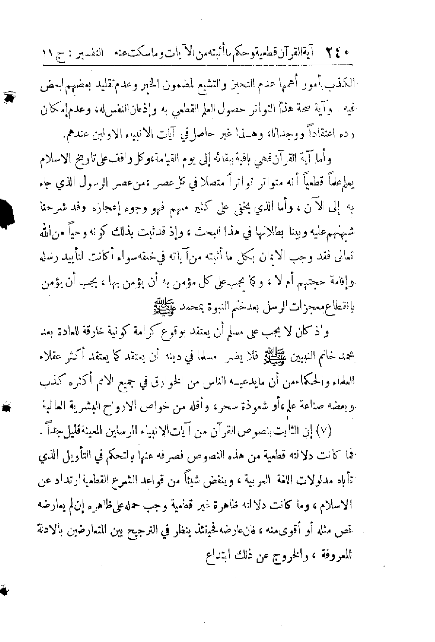 وَأَنَّهُ لَمْ يُعْرَفْ عَنْهُ أَنَّهُ كَانَ يَبْحَثُ فِي شَيْءٍ مِنَ الْعُلُومِ، وَلَا أَنَّهُ نَطَقَ بِشَيْءٍ مِنْ مَسَائِلِهَا، وَالْعِلْمِ بِأَنَّهُ إِنَّمَا جَاءَ بِهَا فِي هَذَا الْقُرْآنِ بَعْدَ اسْتِكْمَالِ سِنِّ الْأَرْبَعِينَ وَهِيَ سِنٌّ لَمْ يُعْرَفْ فِي اسْتِعْدَادِ أَنْفُسِ الْبَشَرِ وَمُدْرَكَاتِ عُقُولِهِمْ، وَلَا فِي تَارِيخِهِمْ أَنَّ صَاحِبَهَا يَأْتَنِفُ مِثْلَهَا ائْتِنَافًا لَمْ يَسْبِقْ لَهُ الْبَدْءُ بِشَيْءٍ مِنْهُ فِي أَنْفِ عُمْرِهِ، وَآنِفَةِ شَبَابِهِ وَشَرْخِهِ، رَاجِعْ هَذَا كُلَّهُ وَتَأَمَّلْهُ جُمْلَةً وَاحِدَةً تَجِدْ عَقْلَكَ مُضْطَرًّا إِلَى الْجَزْمِ بِأَنَّ هَذَا كُلَّهُ فَوْقَ اسْتِعْدَادِ بَشَرٍ أُمِّيٍّ أَوْ مُتَعَلِّمٍ، وَأَنَّهُ وَحْيٌ مِنَ اللهِ تَعَالَى.