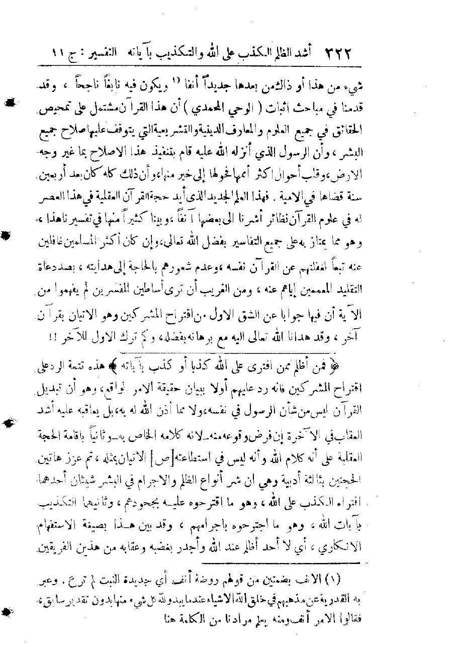 وَقَعُوا فِيهِ مِنَ الشِّرْكِ وَلَا يَنْتَبِهُونَ لِمَا حَلَّ بِهِمْ مِنَ الْمُخَالَفَةِ لِمَعْنَى ((لَا إِلَهَ إِلَّا اللهُ)) وَمَدْلُولِ (قُلْ هُوَ اللهُ أَحَدٌ) (112: 1) ((وَأَعْجَبُ مِنْ هَذَا اطِّلَاعُ أَهْلِ الْعِلْمِ عَلَى مَا يَقَعُ مِنْ هَؤُلَاءِ وَلَا يُنْكِرُونَ عَلَيْهِمْ، وَلَا يَحُولُونَ بَيْنَهُمْ وَبَيْنَ الرُّجُوعِ إِلَى الْجَاهِلِيَّةِ الْأُولَى بَلْ إِلَى مَا هُوَ أَشَدُّ مِنْهَا ; فَإِنَّ أُولَئِكَ يَعْتَرِفُونَ بِأَنَّ اللهَ سُبْحَانَهُ هُوَ الْخَالِقُ الرَّازِقُ، الْمُحْيِي الْمُمِيتُ، الضَّارُّ النَّافِعُ، وَإِنَّمَا يَجْعَلُونَ أَصْنَامَهُمْ شُفَعَاءَ لَهُمْ عِنْدَ اللهِ وَمُقَرِّبِينَ لَهُمْ إِلَيْهِ، وَهَؤُلَاءِ يَجْعَلُونَ لَهُمْ قُدْرَةً عَلَى الضُّرِّ وَالنَّفْعِ، وَيُنَادُونَهُمْ تَارَةً عَلَى الِاسْتِقْلَالِ وَتَارَةً مَعَ ذِي الْجَلَالِ وَكَفَاكَ مِنْ شَرٍّ سَمَاعُهُ، وَاللهُ نَاصِرُ دِينِهِ، وَمُطَهِّرُ شَرِيعَتِهِ مِنْ أَوَضَارِ الشِّرْكِ وَأَدْنَاسِ الْكُفْرِ. وَلَقَدْ تَوَسَّلَ الشَّيْطَانُ أَخْزَاهُ اللهُ بِهَذِهِ الذَّرِيعَةِ إِلَى مَا تَقَرُّ بِهِ عَيْنُهُ وَيَنْثَلِجُ بِهِ صَدْرُهُ مِنْ كُفْرِ كَثِيرٍ مِنْ هَذِهِ الْأُمَّةِ الْمُبَارَكَةِ وَهُمْ يَحْسَبُونَ أَنَّهُمْ يُحْسِنُونَ صُنْعًا (18: 104) ((إِنَّا لِلَّهِ وَإِنَّا إِلَيْهِ رَاجِعُونَ)) اهـ.