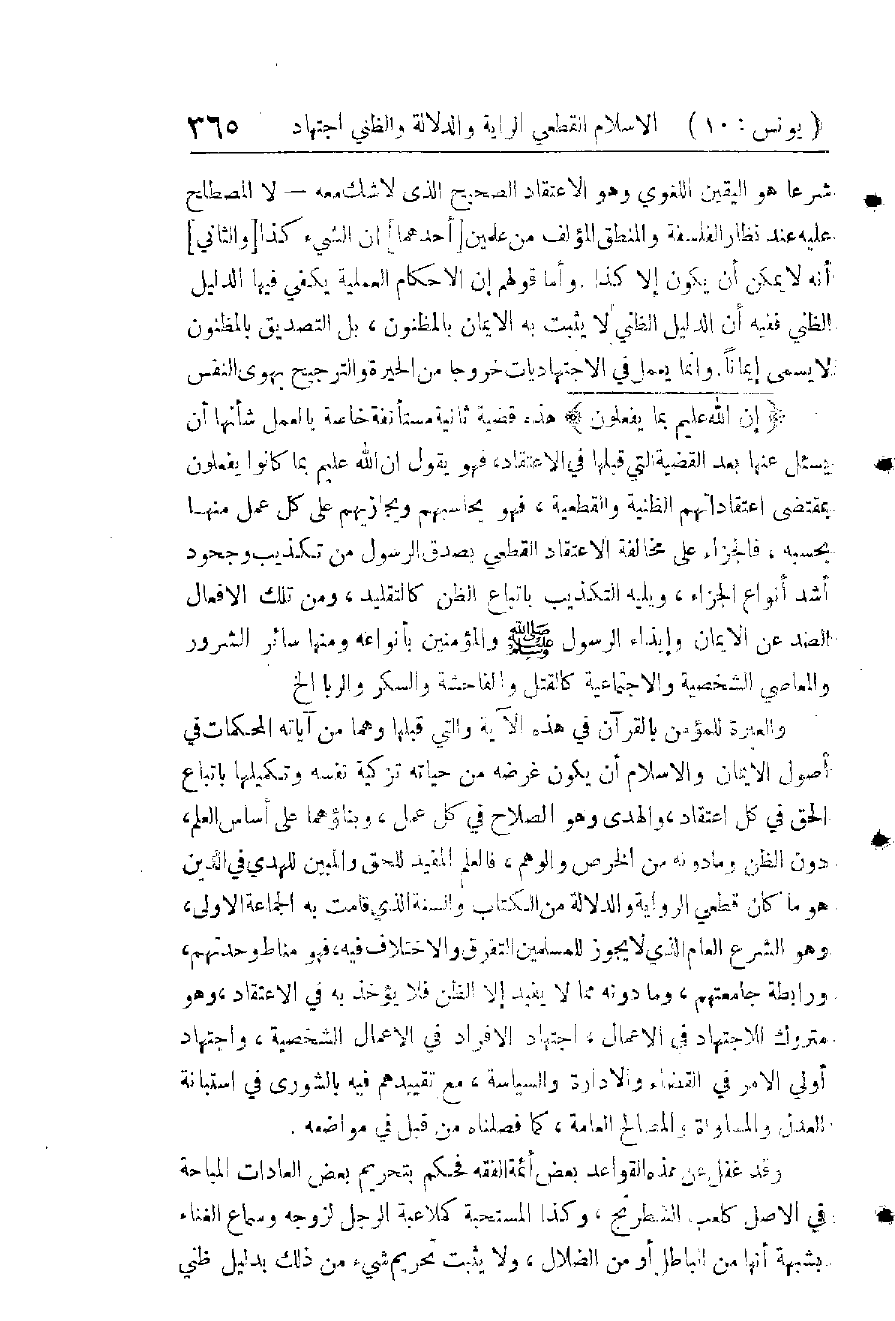 كَمَا ثَبَتَ بُطْلَانُ مِثْلِهَا مِنْ مُسَلَّمَاتِ الْقُرُونِ الْمَاضِيَةِ إِلَى السِّنِينَ الْأَخِيرَةِ مِنْ هَذَا الْقَرْنِ الْعِشْرِينَ الْمِيلَادِيِّ، الَّتِي تَرَجَّحَ فِيهَا أَنَّ كُلَّ مَا عُرِفَ فِي هَذَا الْكَوْنِ مِنْ مَظَاهِرِ الْمَادَّةِ وَالْقُوَّةِ هُوَ مَظْهَرٌ لِتَرْكِيبٍ خَاصٍّ مَجْهُولٍ لِجُزْئَيِ الْكَهْرَبَاءِ الْإِيجَابِيِّ وَالسَّلْبِيِّ، الْمُعَبَّرِ عَنْهَا بِكَلِمَتَيِ (الْبُرُوتُونِ وَالْإِلِكْتِرُونِ) فَبَطَلَتْ بِهَذَا جَمِيعُ النَّظَرِيَّاتِ الْعِلْمِيَّةِ فِي الْمَادَّةِ وَالْقُوَّةِ، فَكَيْفَ يَجُوزُ إِذَنْ تَأْوِيلُ نَصٍّ دِينِيٍّ قَطْعِيِّ الرِّوَايَةِ وَالدَّلَالَةِ فِي خَبَرٍ عَنْ عَالَمِ الْغَيْبِ مِنَ الْوَحْيِ الْإِلَهِيِّ، لِنَظَرِيَّةٍ ظَنِّيَّةٍ فِي عَالَمِ الشَّهَادَةِ مِنَ الرَّأْيِ الْبَشَرِيِّ؟ .