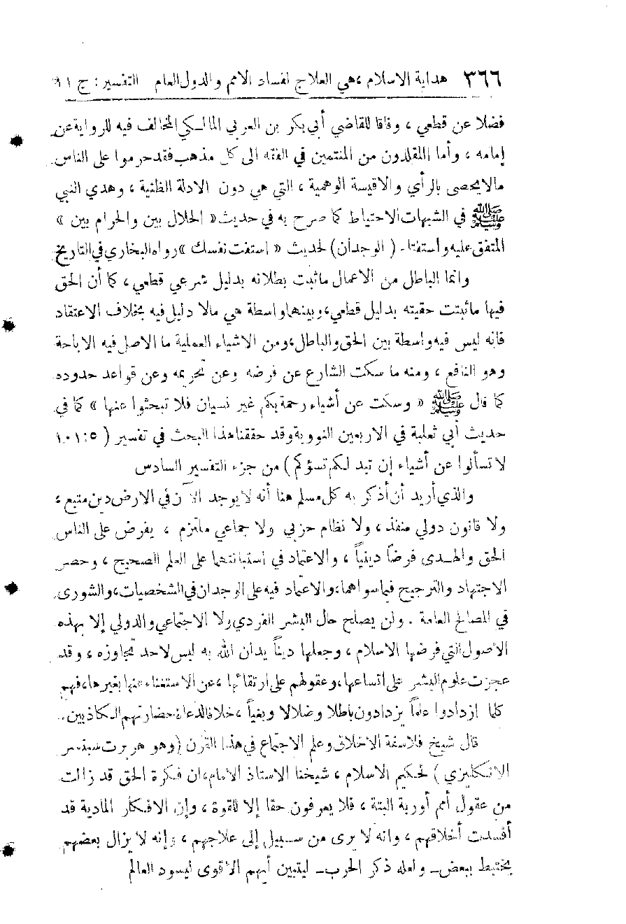 وَمِنْهُ، وَفِي الْبَابِ الْأَوَّلِ مِنْهُ: ((فَلَوْ رَأَيْنَا الصُّوفِيَّ يَتَرَبَّعُ فِي الْهَوَاءِ لَا يُعْبَأُ بِهِ إِلَّا إِذَا امْتَثَلَ أَمْرَ اللهِ وَاجْتَنَبَ نَهْيَهَ فِي الْمُحَرَّمَاتِ الْوَارِدَةِ فِي الْكِتَابِ وَالسُّنَّةِ، مُخَاطِبًا بِتَرْكِهَا كُلَّ الْخَلْقِ الْمُكَلَّفِينَ لَا يَخْرُجُ عَنْ ذَلِكَ أَحَدٌ مِنْهُمْ، وَمَنِ ادَّعَى أَنَّ بَيْنَهُ وَبَيْنَ اللهِ تَعَالَى حَالَةً أَسْقَطَتْ عَنْهُ التَّكَالِيفَ الشَّرْعِيَّةَ مِنْ غَيْرِ ظُهُورِ أَمَارَةٍ تُصَدِّقُهُ عَلَى دَعْوَاهُ فَهُوَ كَاذِبٌ، كَمَنْ يَشْطَحُ مِنْ شُهُودٍ فِي حَضْرَةٍ خَيَالِيَّةٍ عَلَى اللهِ وَعَلَى أَهْلِ اللهِ، وَلَا يَرْفَعُ بِالْأَحْكَامِ الشَّرْعِيَّةِ رَأْسًا، وَلَا يَقِفُ عِنْدَ حُدُودِ اللهِ تَعَالَى مَعَ وُجُودِ عَقْلِ التَّكْلِيفِ عِنْدَهُ، فَهَذَا مَطْرُودٌ عَنْ بَابِ الْحَقِّ، مُبَعْدٌ
