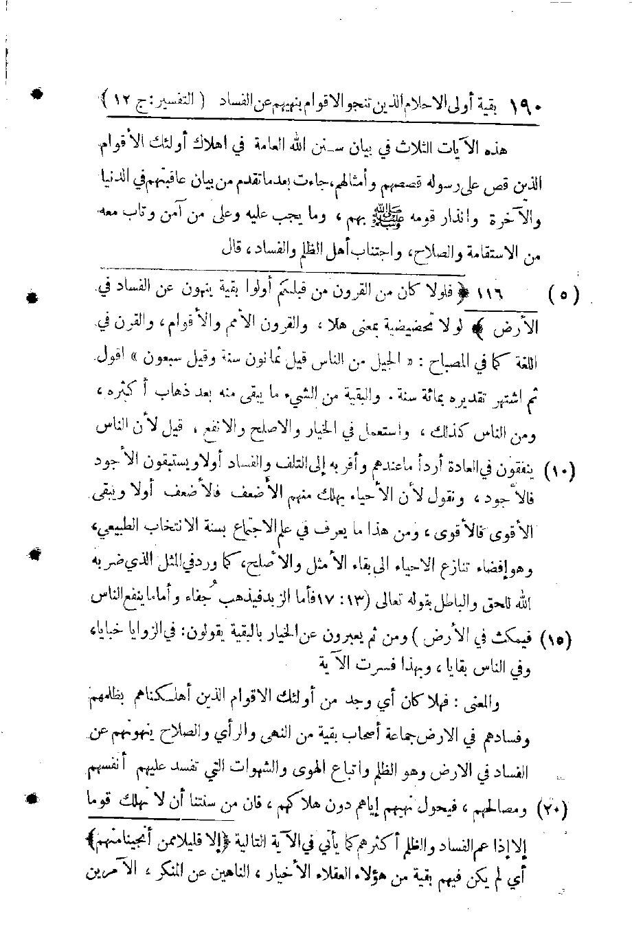 بَيَّنَ لَهُمْ مَا هُوَ مَنْجَاةٌ لِلْأُمَّةِ وَالشَّعْبِ مِنَ الْهَلَاكِ فِي الدُّنْيَا قَبْلَ الْآخِرَةِ، وَهُوَ وُجُودُ طَائِفَةٍ عَظِيمَةِ التَّأْثِيرِ فِيهَا تَنْهَاهَا عَنِ الْفَسَادِ فِي الْأَرْضِ بِالظُّلْمِ وَالْفَسَادِ وَالْفُسُوقِ بِارْتِكَابِ الْفَوَاحِشِ وَالْمُنْكَرَاتِ، وَهُوَ قَوْلُهُ: - فَلَوْلَا كَانَ مِنَ الْقُرُونِ مِنْ قَبْلِكُمْ أُولُو بَقِيَّةٍ يَنْهَوْنَ عَنِ الْفَسَادِ فِي الْأَرْضِ - 116 وَبَيَّنَ لَنَا عَقِبَ هَذَا فِي الْآيَةِ أَنَّ الْقُرُونَ الَّتِي أَهْلَكَهَا لَمْ يَكُنْ فِيهَا إِلَّا قَلِيلٌ مِنْ أَمْثَالِ هَؤُلَاءِ هُمُ الَّذِينَ أَنْجَاهُمْ